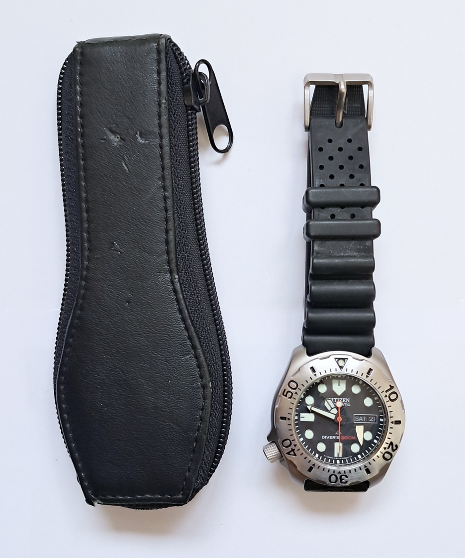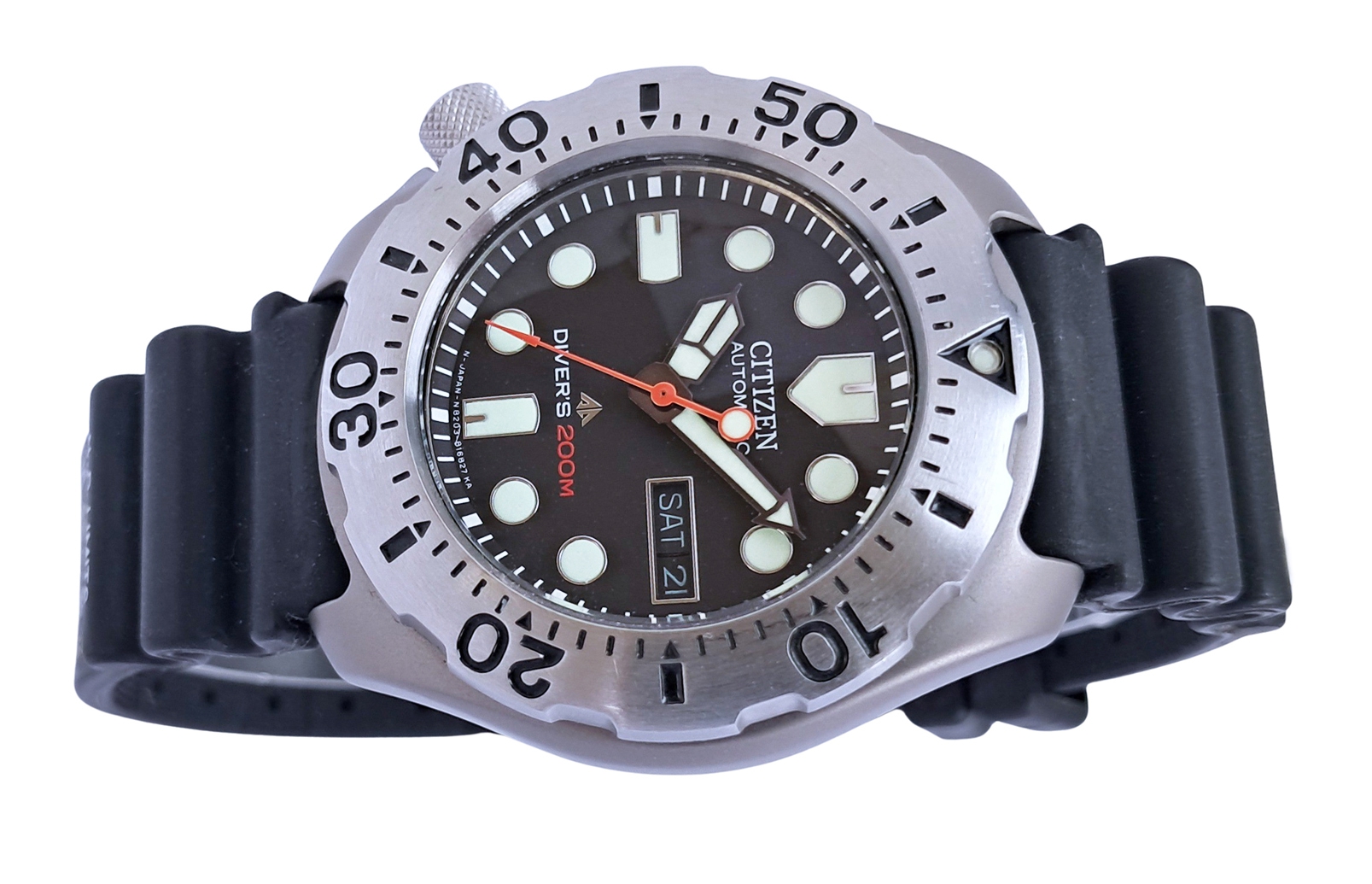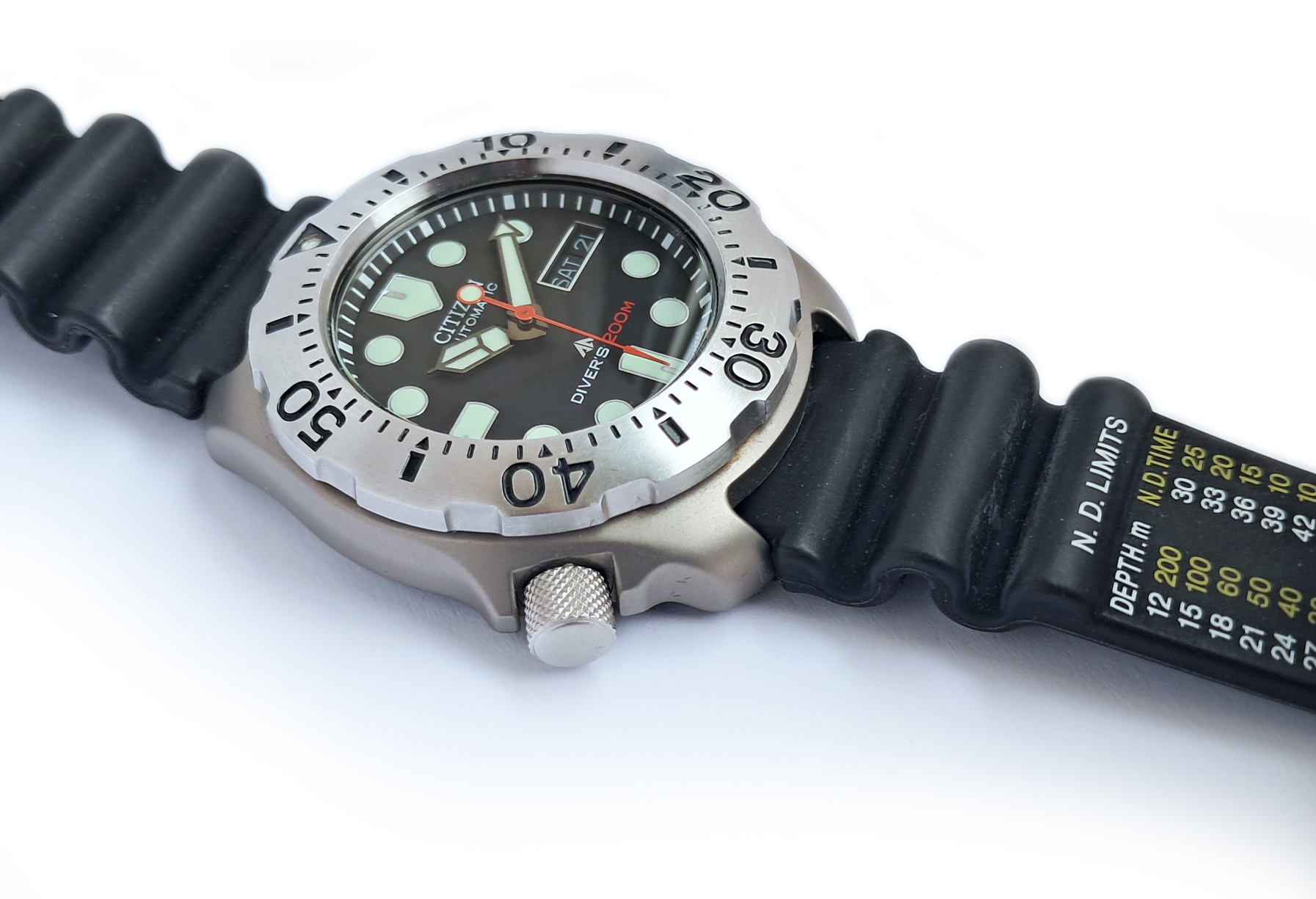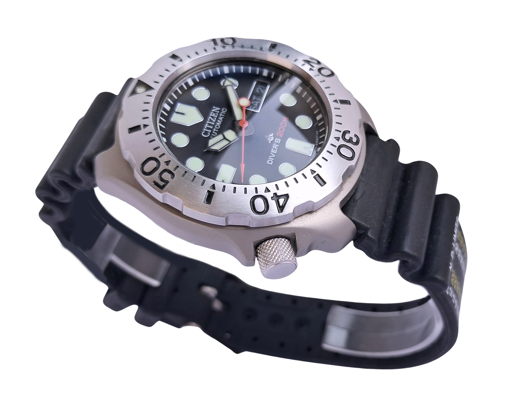Citizen Promaster automatic divers watch in excellent condition. It is a professional standard divers watch, with a 200 meter water resistance, however this is untested. It is in a thick and chunky titianium case with uni directional thick rotating bezel. It comes on a rubber divers strap with an ND Limits table (no decompression limits), no box or papers, comes in a travel case