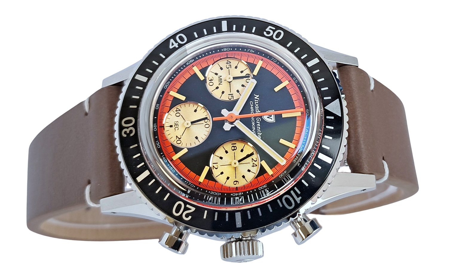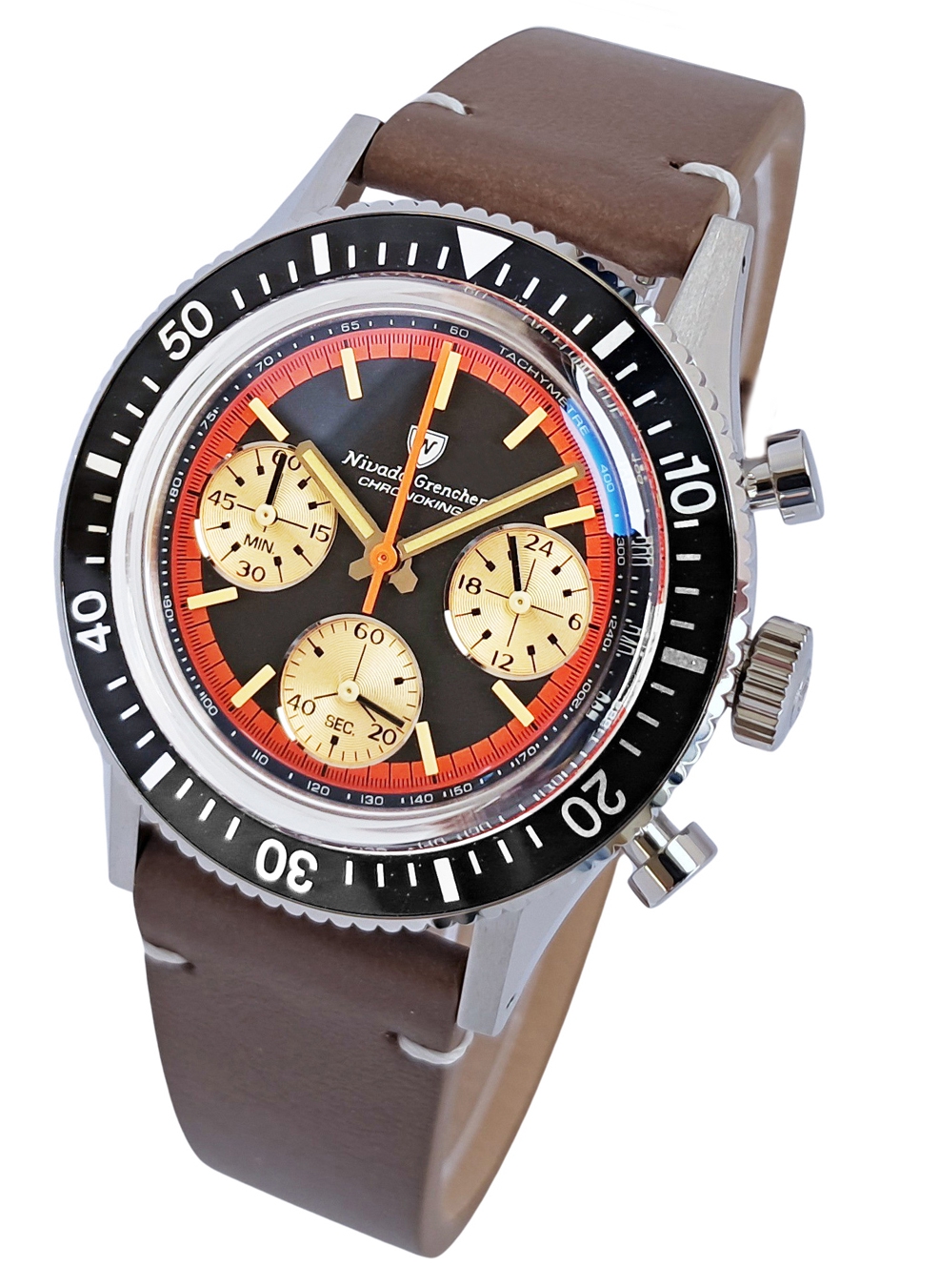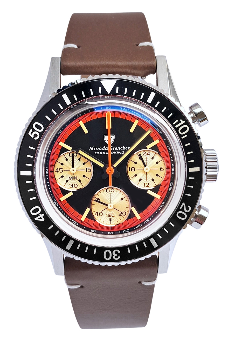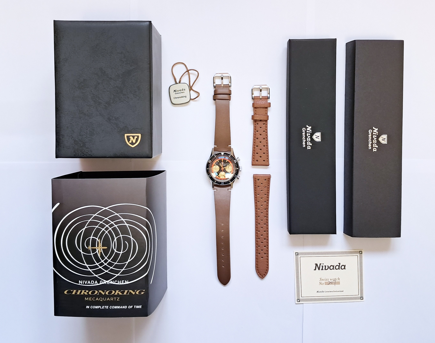 Brand new and unworn Nivada Grenchecn Chrono King Paul Newman mecha quartz chronograph. This is a reproduction of their original 1960’s Chrono King model. The original model form the 60’s had a Valjoux 72 hand winding movement, the same as the Daytona, and the dial was similar to the Daytona worn by Payl Newman, which is how it has got its name. This modern iteration has got a Seiko’s VK63 meca-quartz movement. It has a double domed sapphire crystal and comes with two straps, complete with box and papers