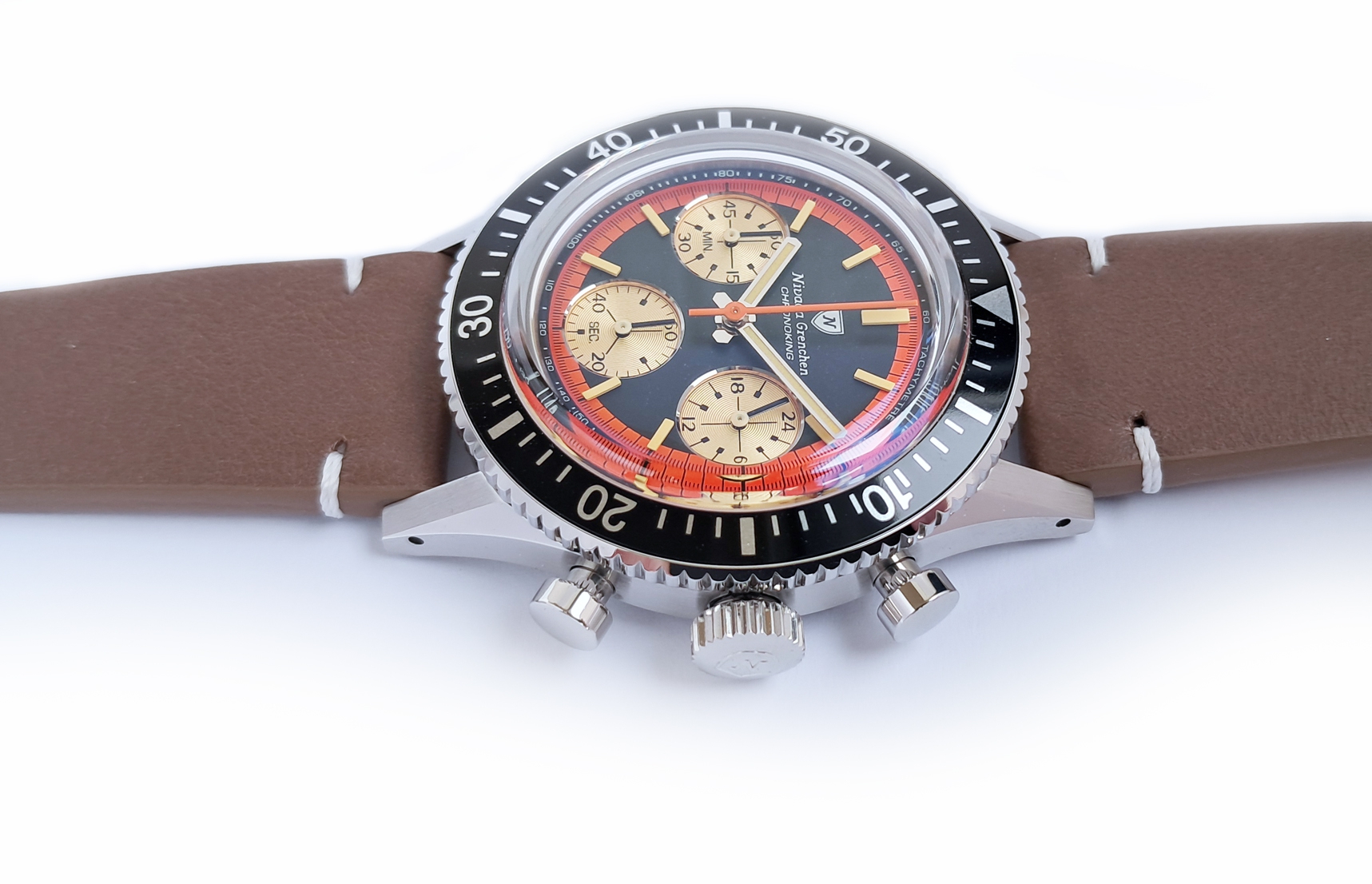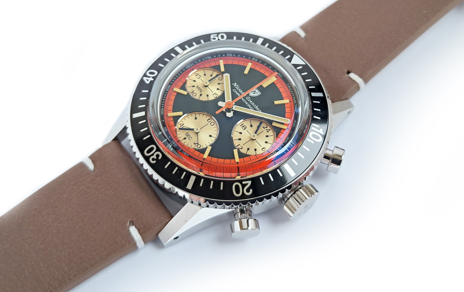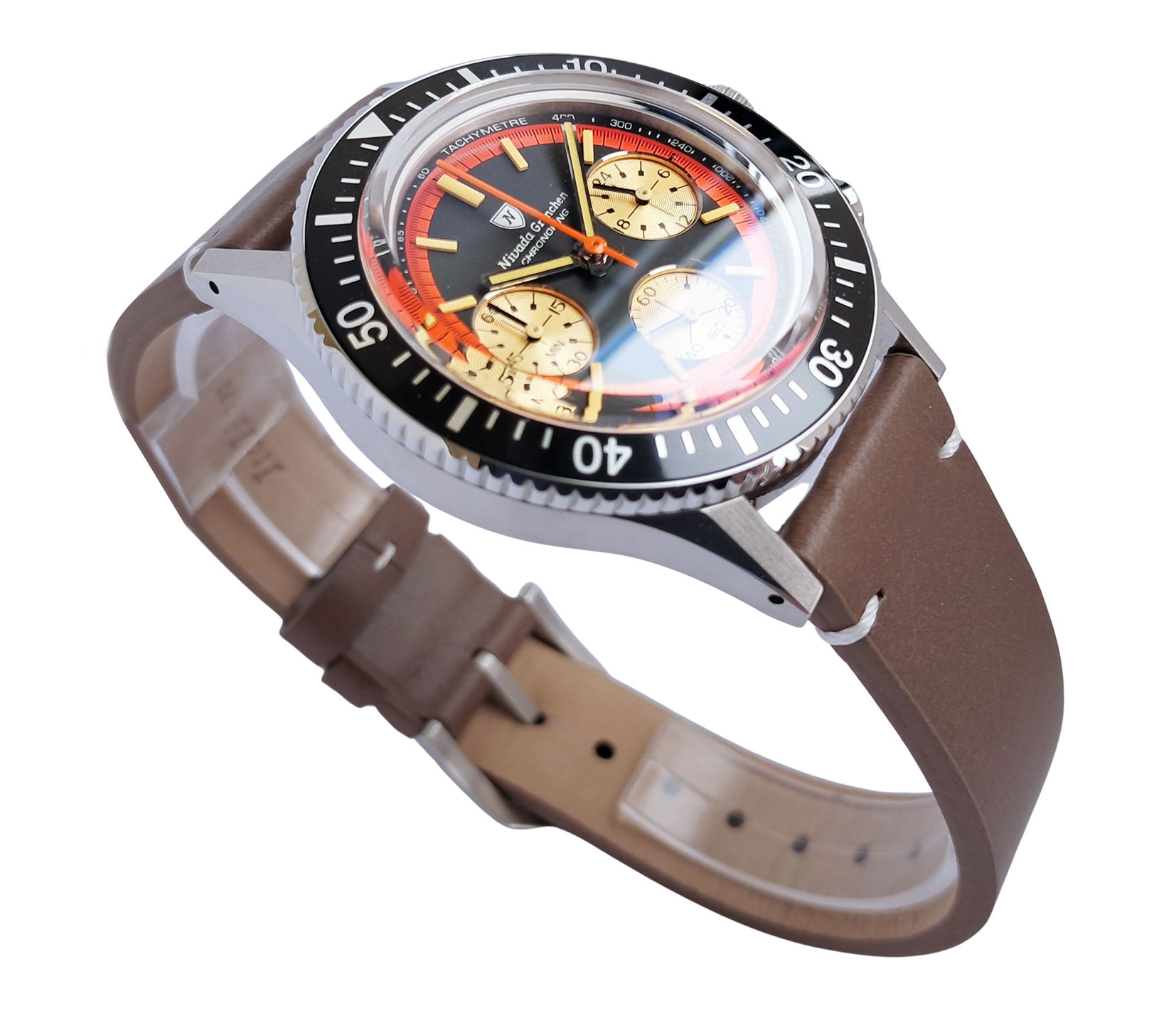 Brand new and unworn Nivada Grenchecn Chrono King Paul Newman mecha quartz chronograph. This is a reproduction of their original 1960’s Chrono King model. The original model form the 60’s had a Valjoux 72 hand winding movement, the same as the Daytona, and the dial was similar to the Daytona worn by Payl Newman, which is how it has got its name. This modern iteration has got a Seiko’s VK63 meca-quartz movement. It has a double domed sapphire crystal and comes with two straps, complete with box and papers