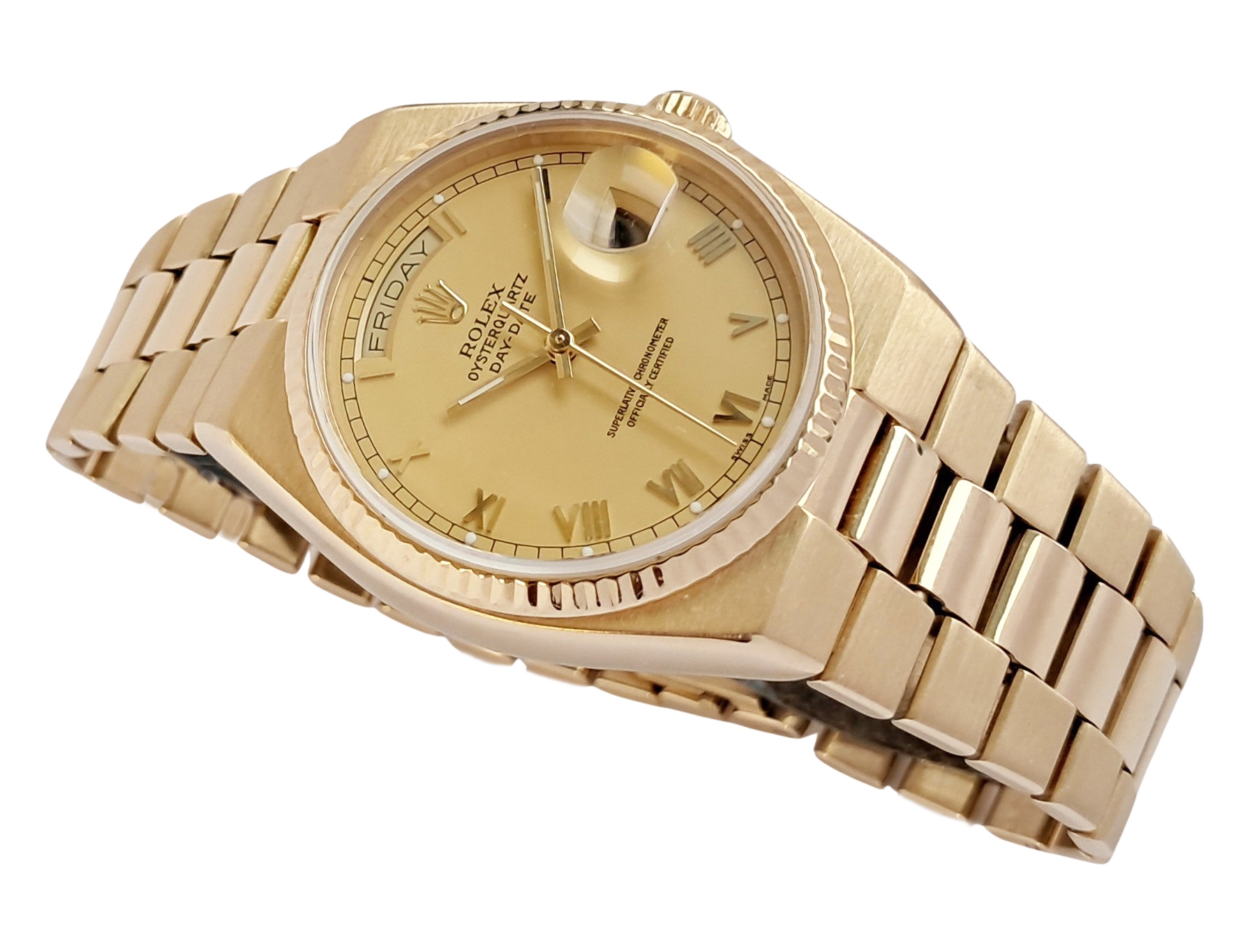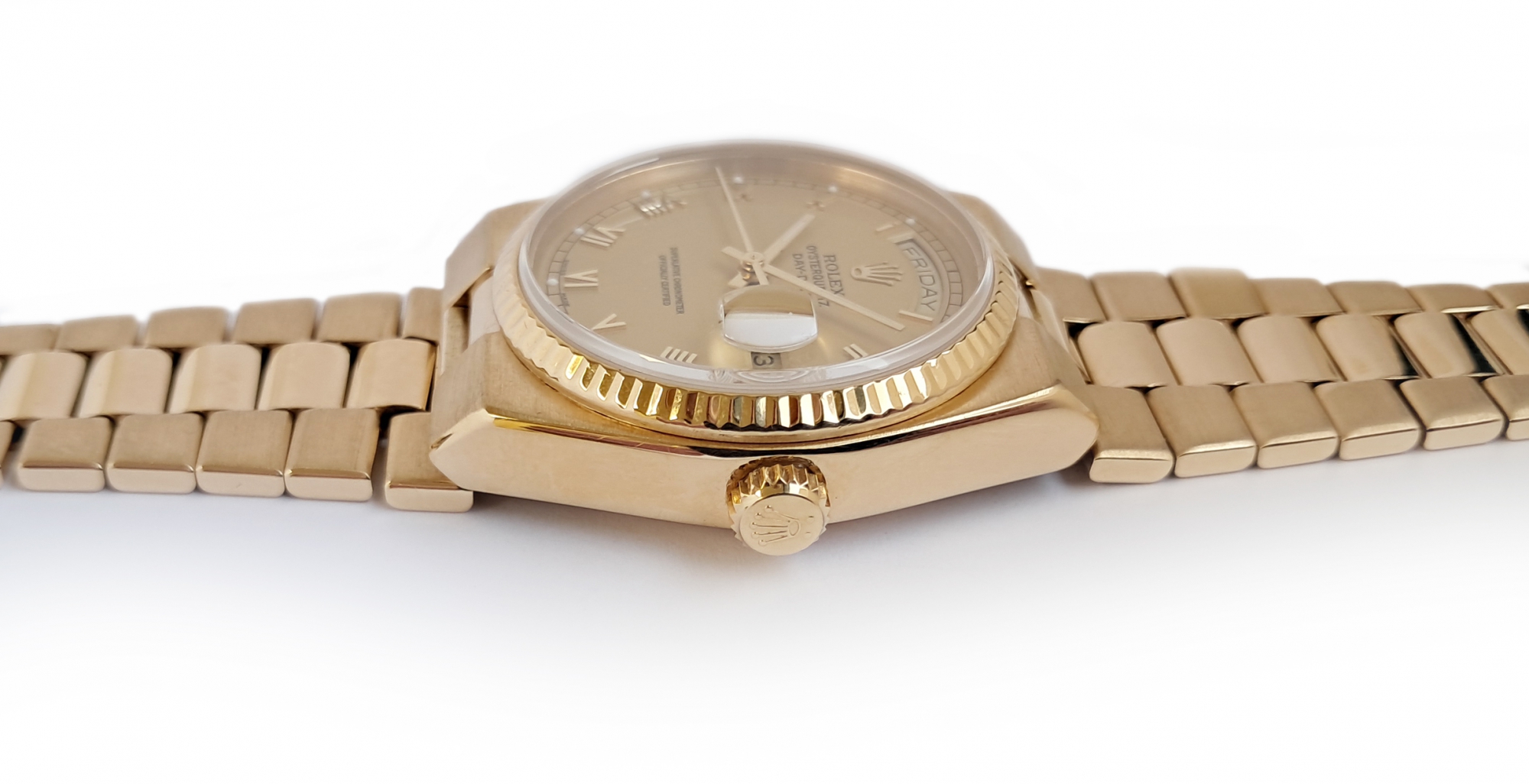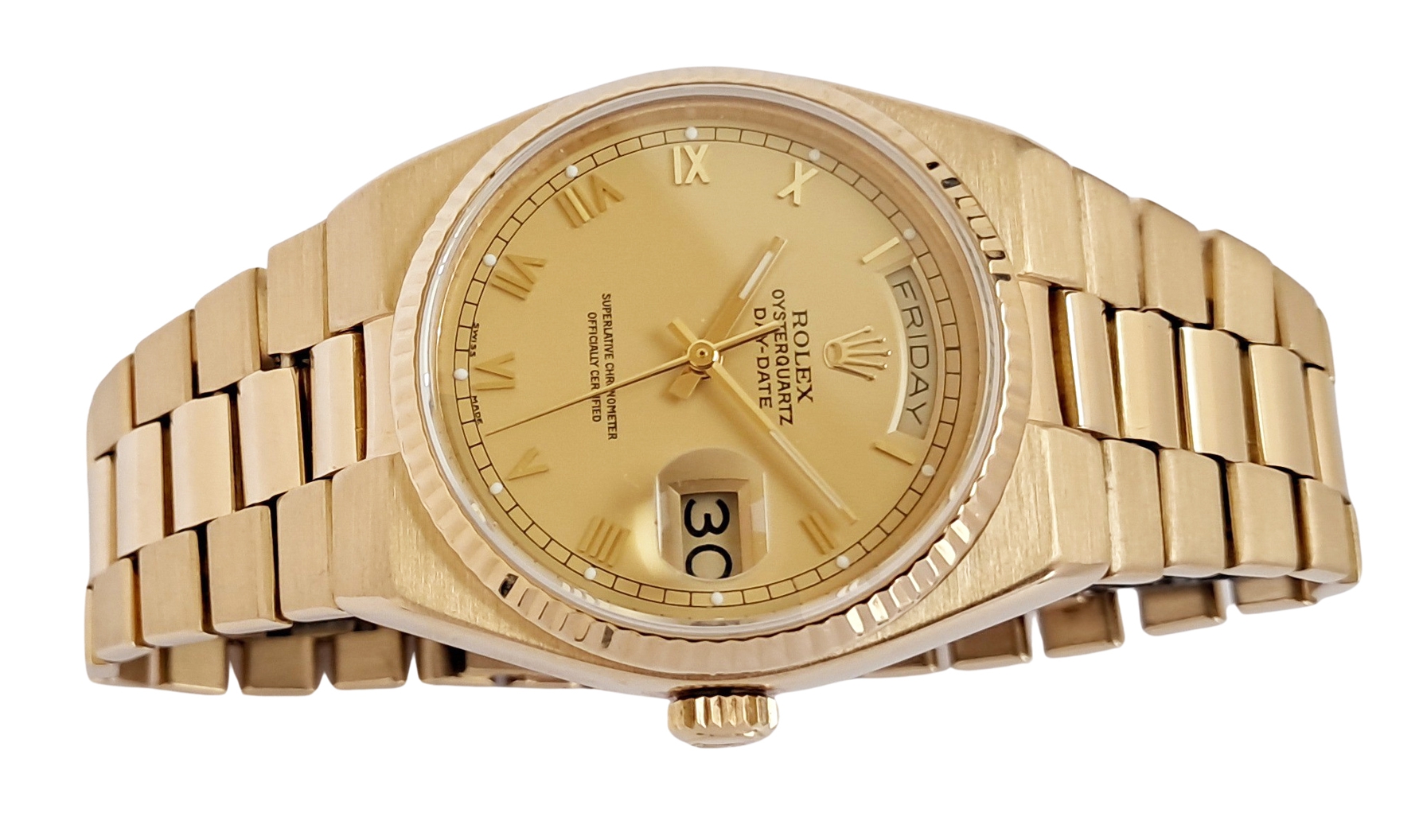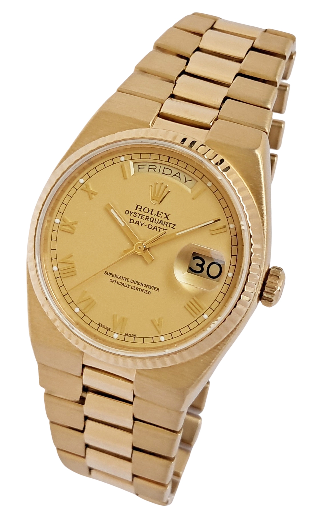 Mint condition Rolex Oysterquartz Day Date - Superlative Chronometer Officially Certified in 18 karat gold. The watch dates to around 1981. It was serviced by Rolex in August 2016 at a cost of £1,135. It has since had a service and battery change at an independent workshop in 2025. It comes with the Rolex service warranty card as well as the receipt from this service, plus the receipt from the recent independent workshop service. The watch is the classic Day Date which one of Rolexes best selling models and a flagship product of Rolex over many years. The Oysterquartz watches are now becoming very collectible due to their unique case shapes and the rarity of the watch. Rolex spent many years developing their quartz movement for use in this watch a great investment in the product. As a result the Oysterquartz is one of the most accurate quartz watches ever made. The case and bracelet are heavy and substantial with a stylish and dressy feel about it. Suitable for a 19cm or 7 ¼ inch wrist.