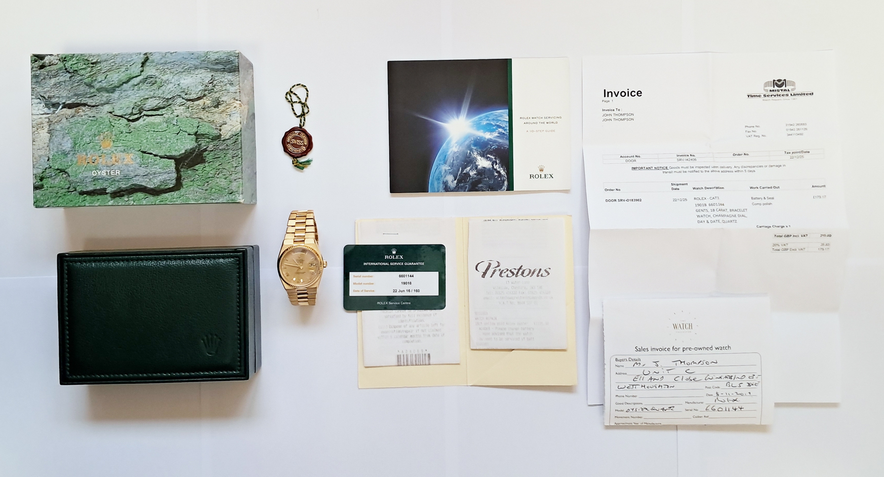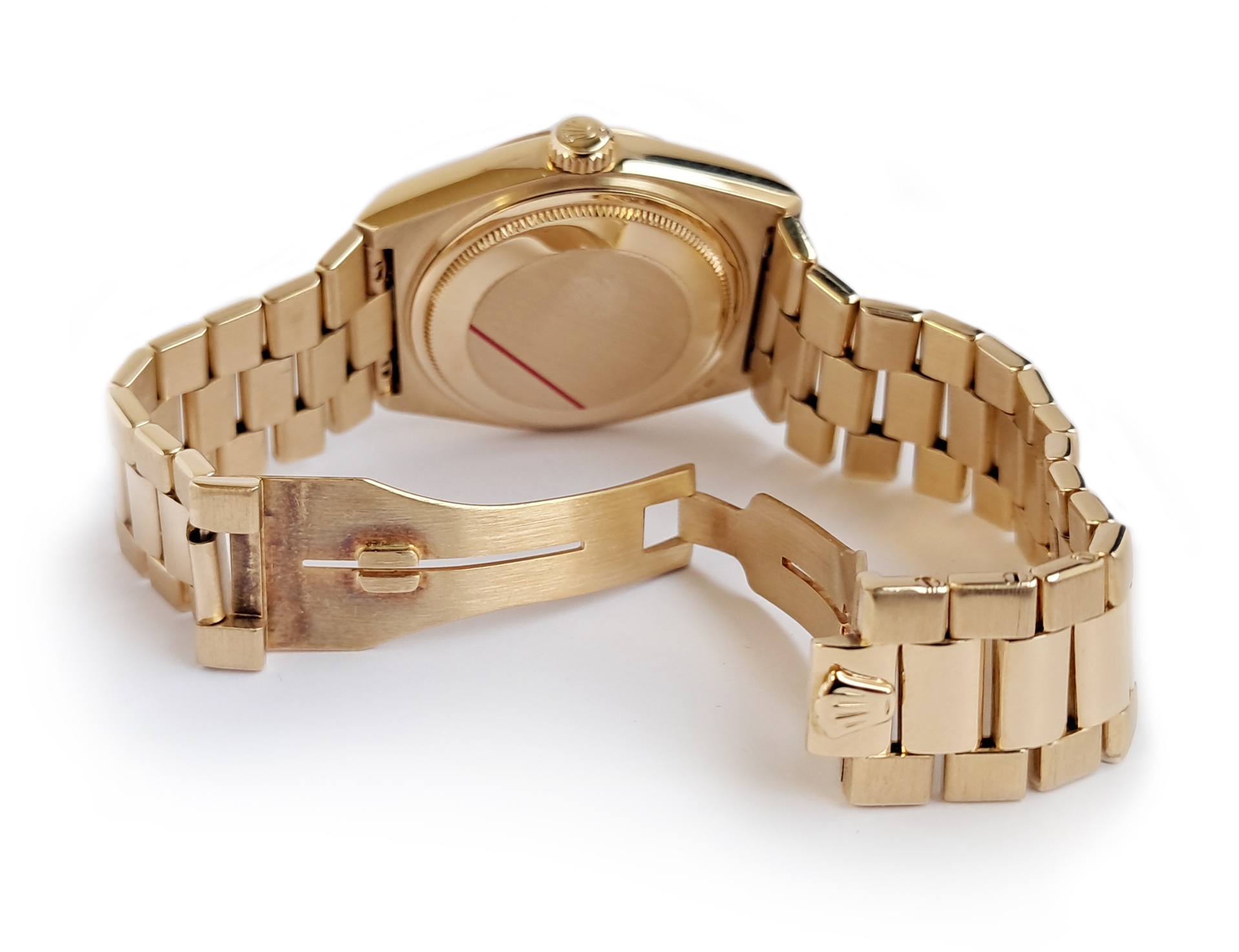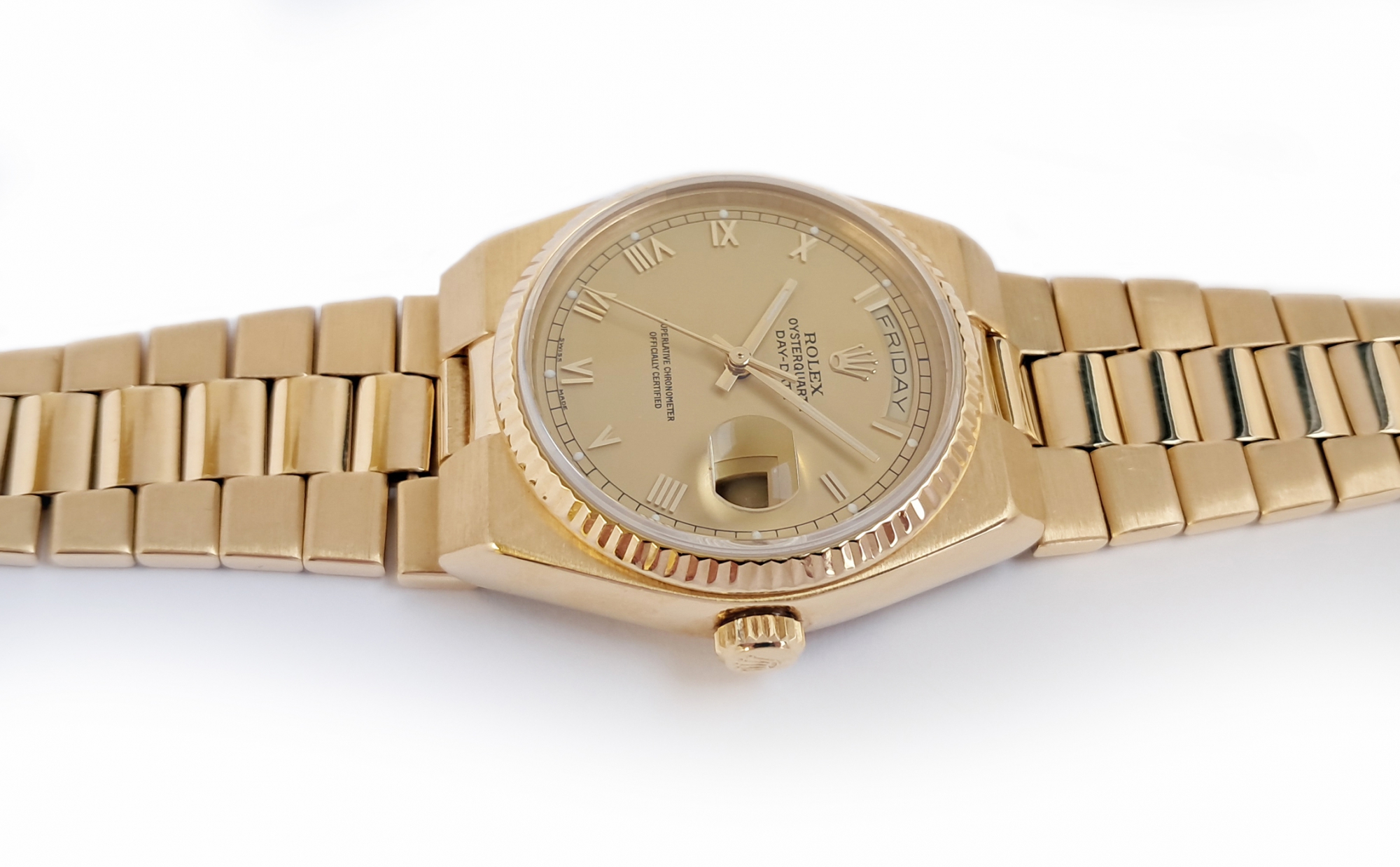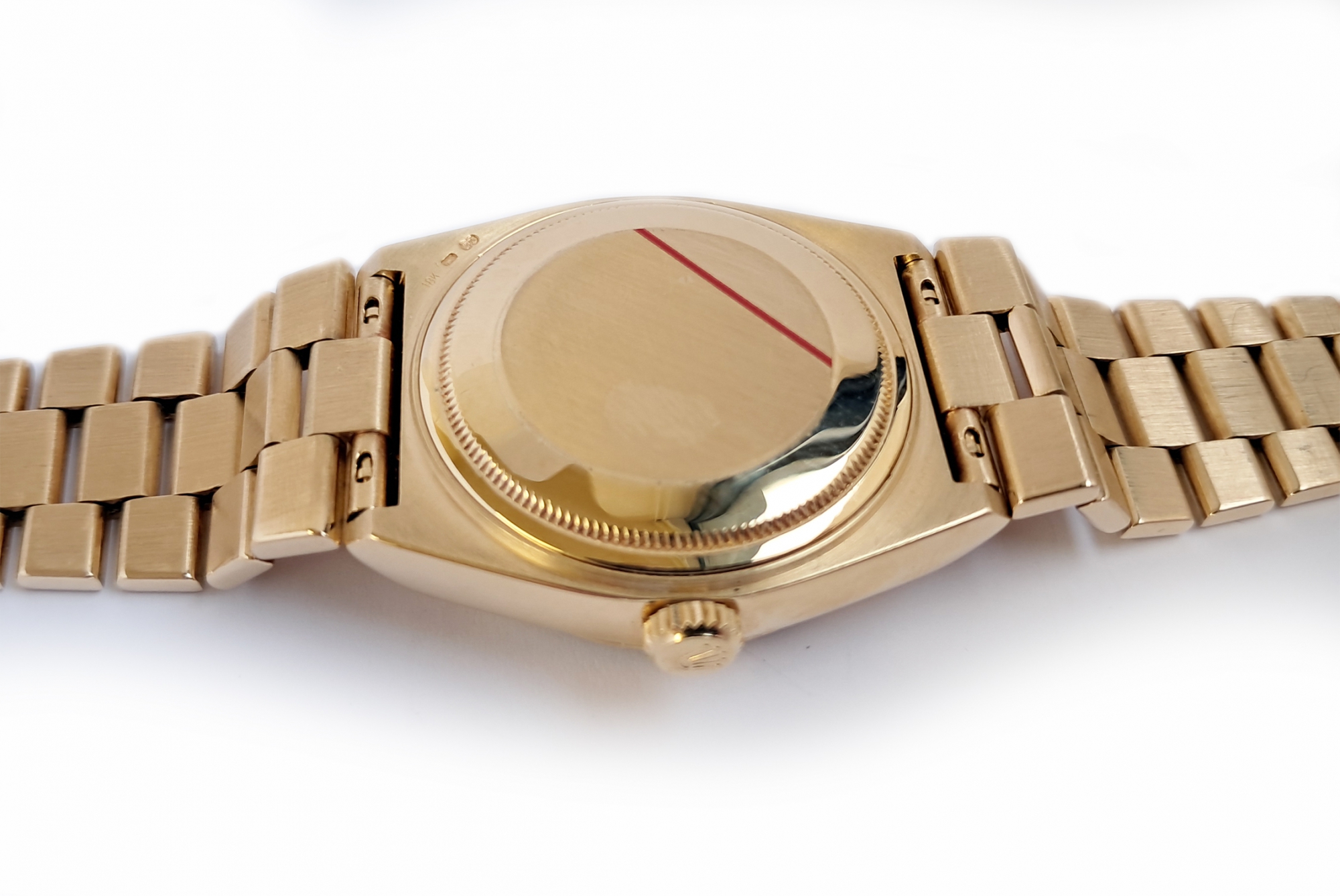 Mint condition Rolex Oysterquartz Day Date - Superlative Chronometer Officially Certified in 18 karat gold. The watch dates to around 1981. It was serviced by Rolex in August 2016 at a cost of £1,135. It has since had a service and battery change at an independent workshop in 2025. It comes with the Rolex service warranty card as well as the receipt from this service, plus the receipt from the recent independent workshop service. The watch is the classic Day Date which one of Rolexes best selling models and a flagship product of Rolex over many years. The Oysterquartz watches are now becoming very collectible due to their unique case shapes and the rarity of the watch. Rolex spent many years developing their quartz movement for use in this watch a great investment in the product. As a result the Oysterquartz is one of the most accurate quartz watches ever made. The case and bracelet are heavy and substantial with a stylish and dressy feel about it. Suitable for a 19cm or 7 ¼ inch wrist.