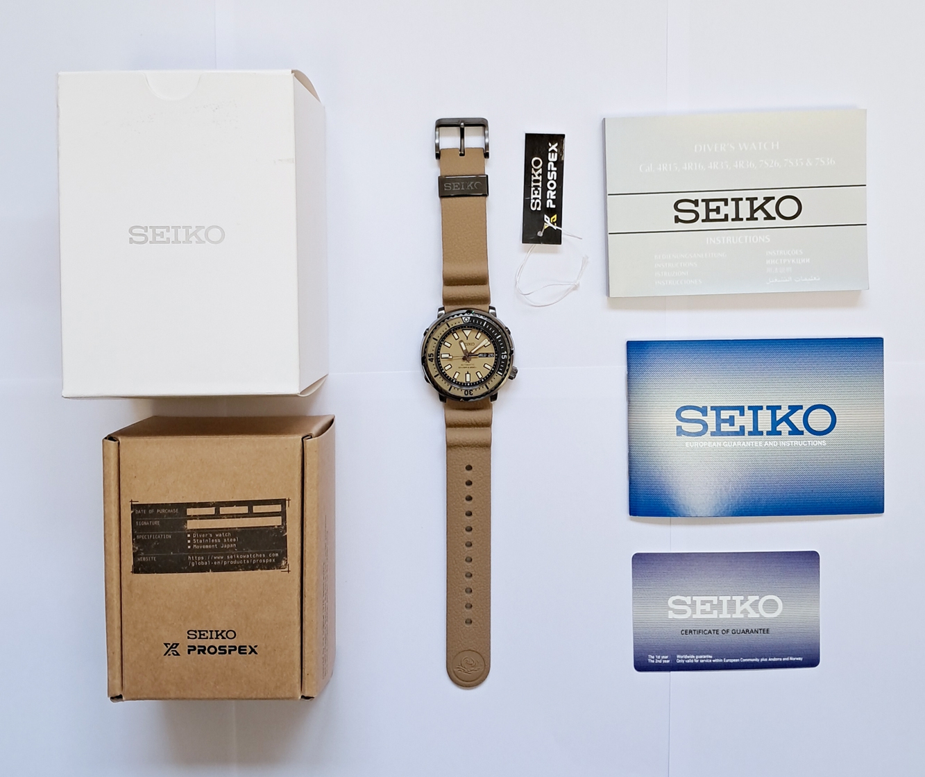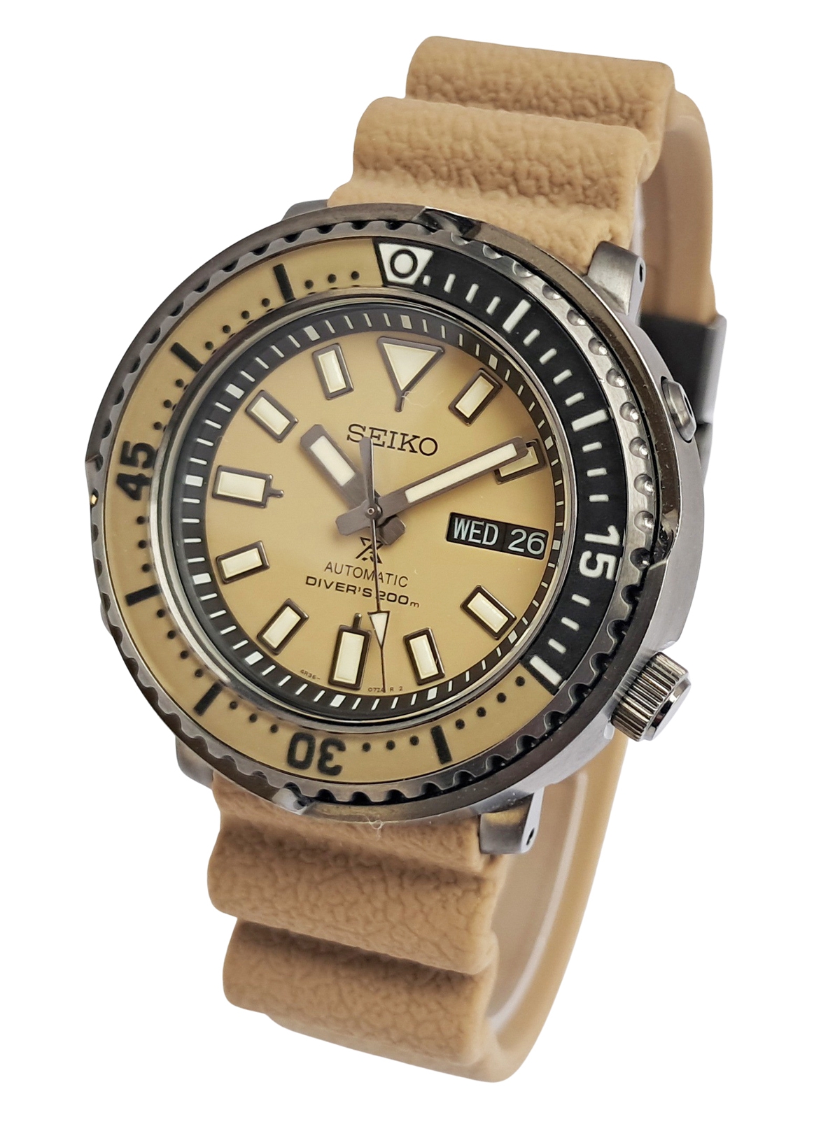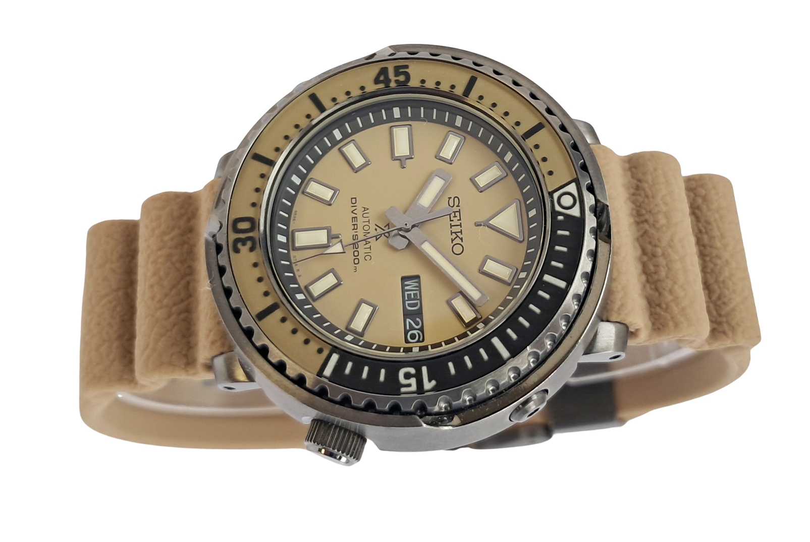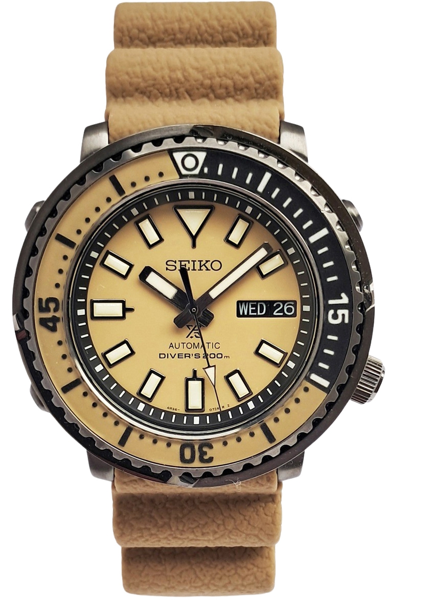 Unused looking condition and barely worn Seiko Prospex Street series Tuna Safari edition. Complete with box and papers. The Street Series was developed to combine looks and substance: coupling Seiko fans enthusiasm for watch design styles alongside the expertise from 5 decades of creating diving watches. The retro tuna shape from the 1975 divers’ model has been channelled into a more compact yet reinforced watch, robust enough to dive 200m under the sea but stylish enough to be worn on the street. The watch shape is affectionately nicknamed by Seiko fans as a Tuna because of its larger diameter and bold shape like a tuna tin. Sand beige dial and strap. The accordion style silicone strap combines high durability and comfort, a strap design invented by Seiko in 1975 as a practical solution to the expansion and contraction of a divers wrist at different depths.