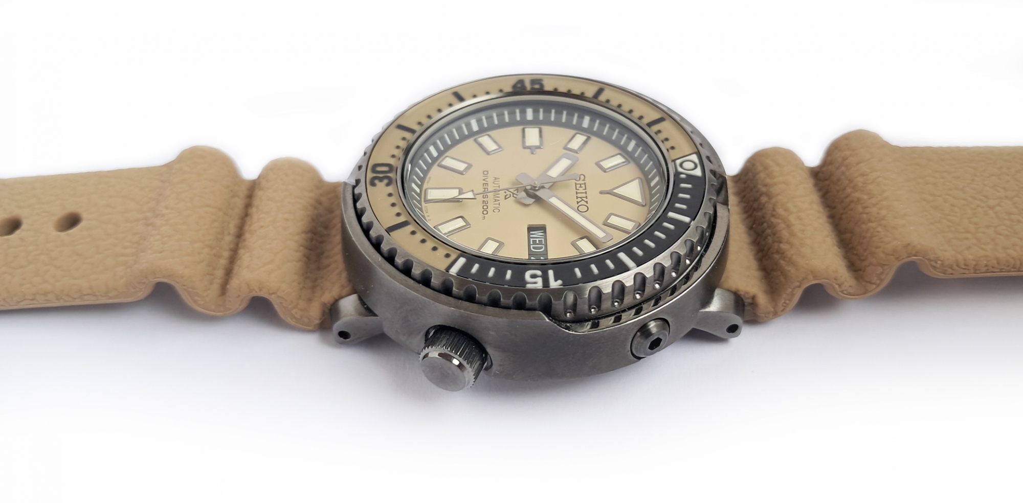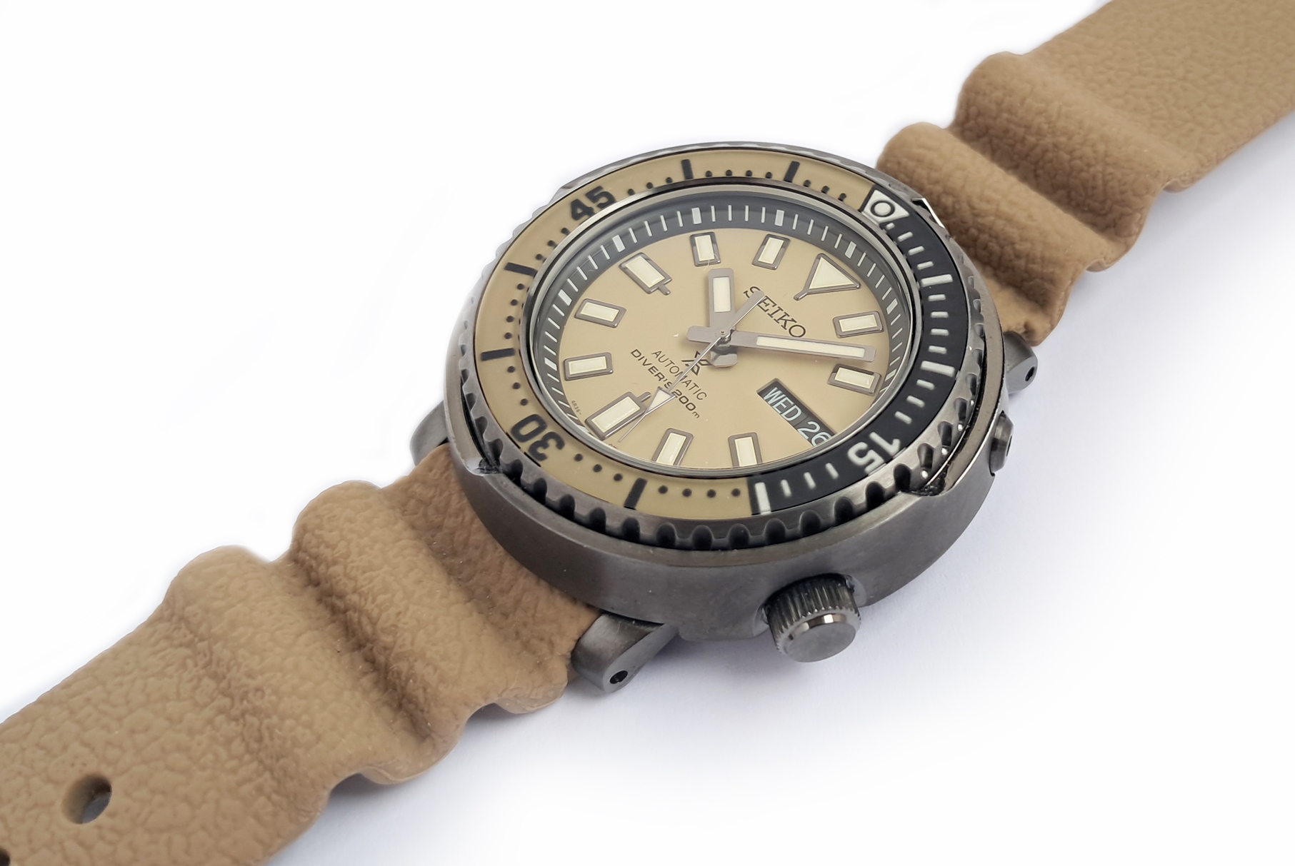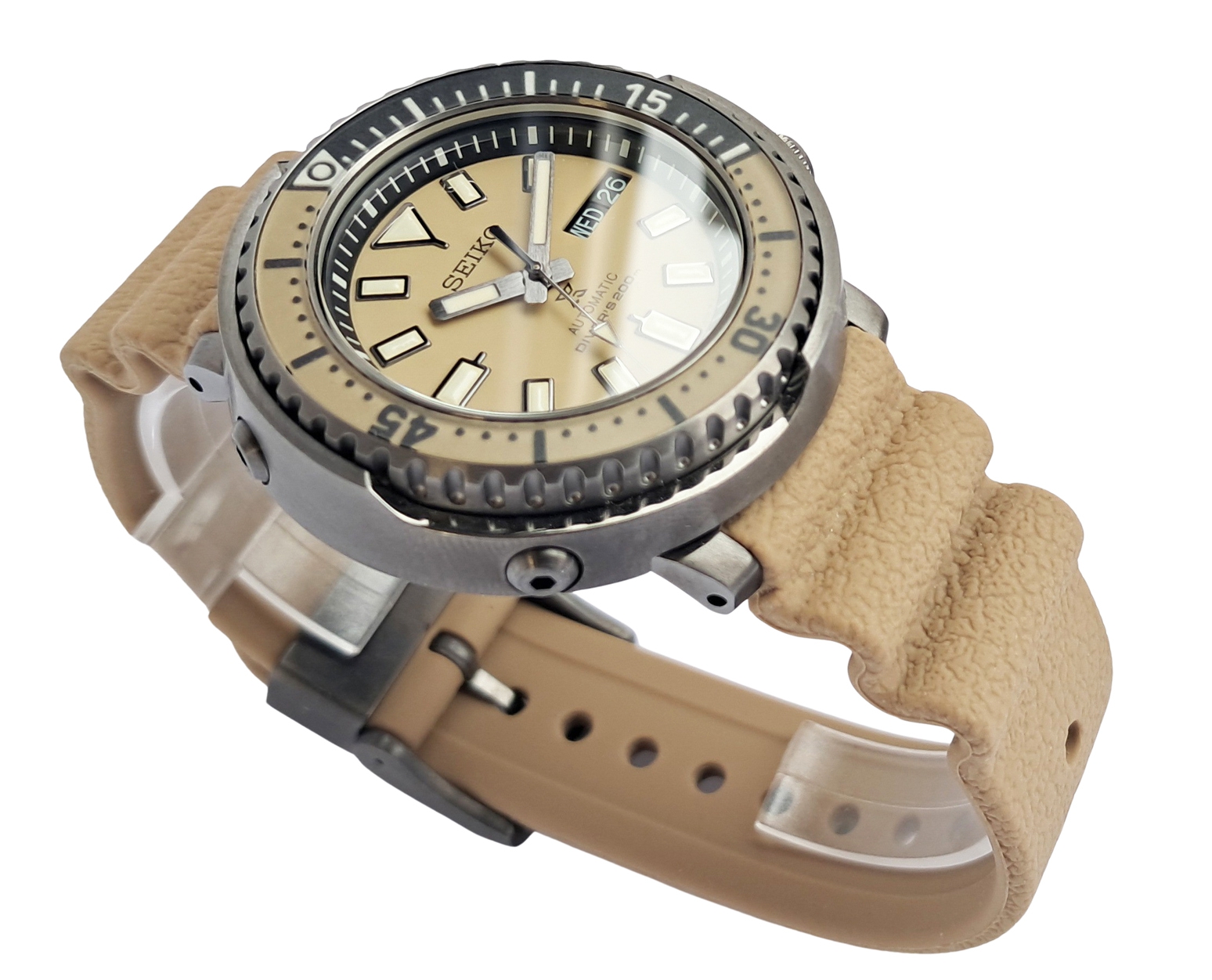 Unused looking condition and barely worn Seiko Prospex Street series Tuna Safari edition. Complete with box and papers. The Street Series was developed to combine looks and substance: coupling Seiko fans enthusiasm for watch design styles alongside the expertise from 5 decades of creating diving watches. The retro tuna shape from the 1975 divers’ model has been channelled into a more compact yet reinforced watch, robust enough to dive 200m under the sea but stylish enough to be worn on the street. The watch shape is affectionately nicknamed by Seiko fans as a Tuna because of its larger diameter and bold shape like a tuna tin. Sand beige dial and strap. The accordion style silicone strap combines high durability and comfort, a strap design invented by Seiko in 1975 as a practical solution to the expansion and contraction of a divers wrist at different depths.
