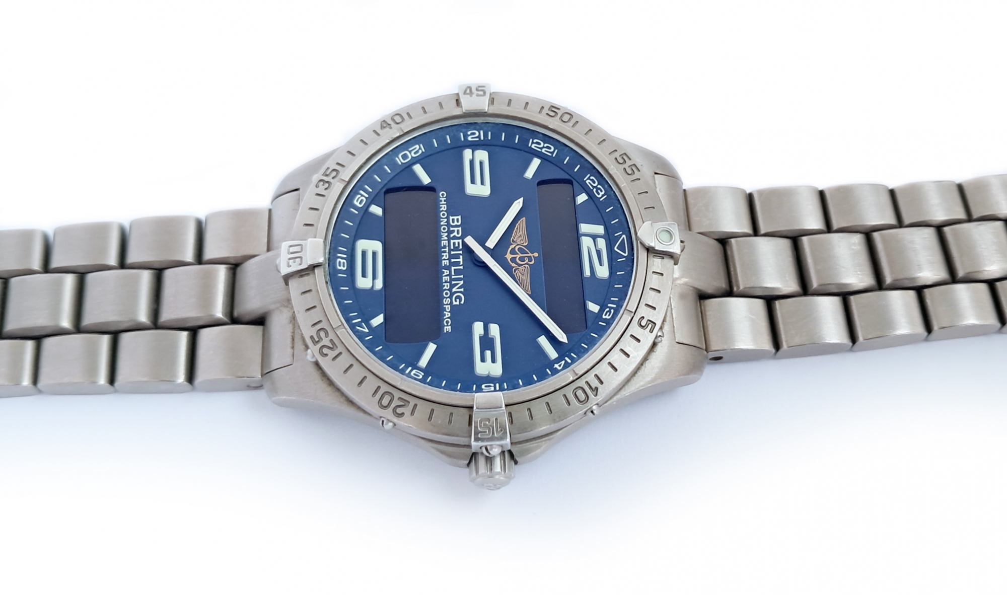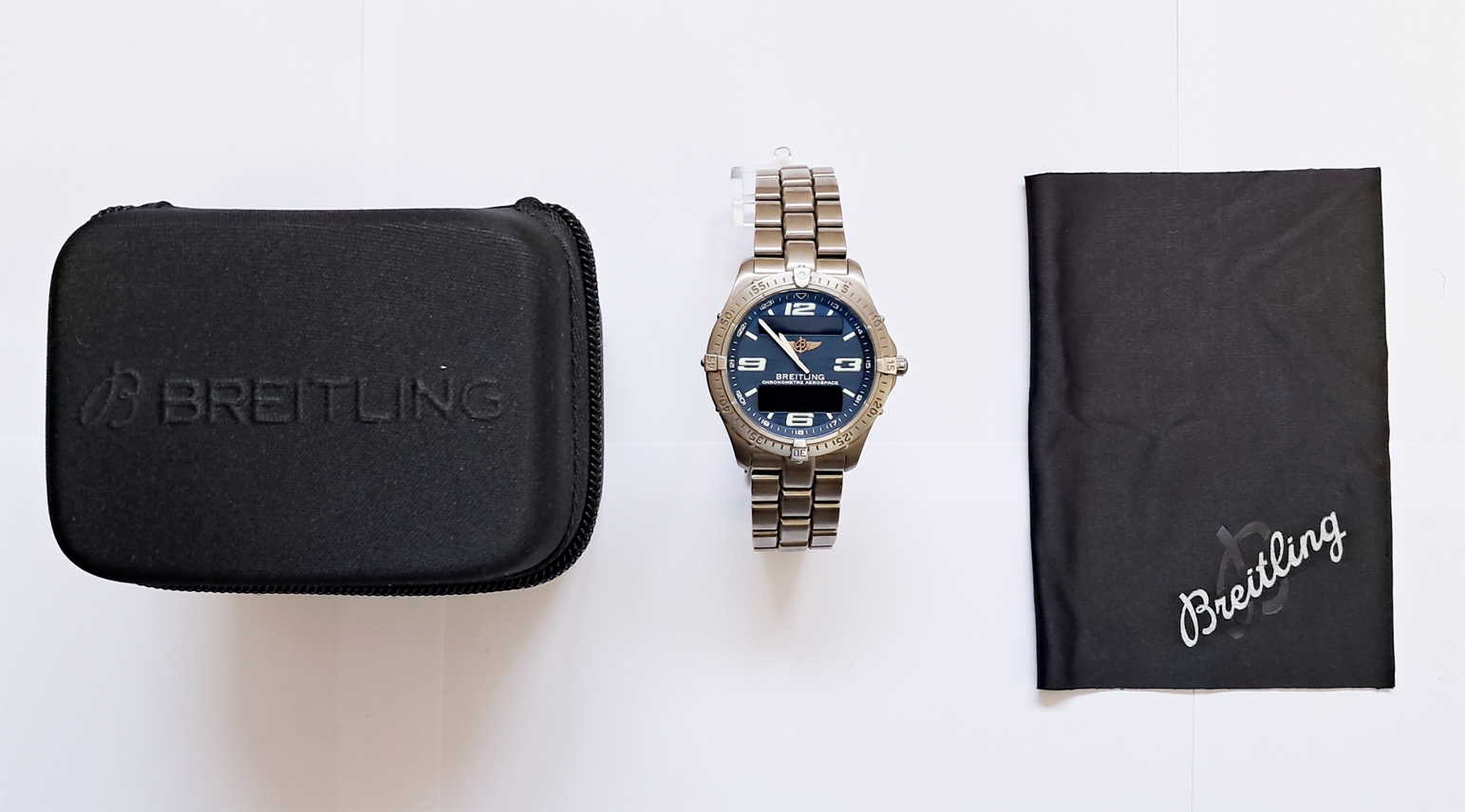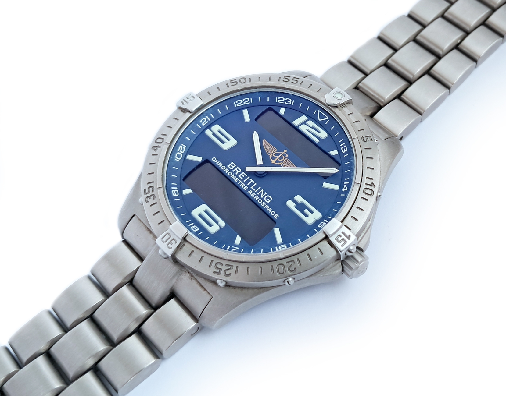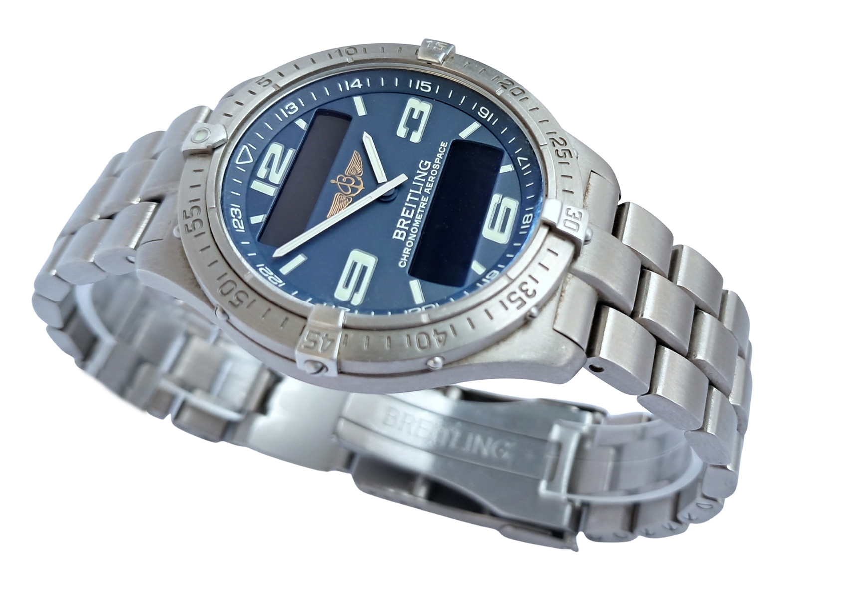 Breitling Chronometre Aerospace analogue and digital wristwatch in titanium. Just had a new battery fitted and working perfectly. The watch is built in titanium. The watch is an officially certified chronometer as indicated by the engraving on the back of the watch. It is a simple watch to use and all of the functions are carried out by the use of the crown. It has a wide range of functions, chronograph, alarm, timer, second time zone, date and day of the week. It’s large LCD digital read out and legible hands keep the Aerospace perfectly and instantly legible under all circumstances. The case is made of titanium which is strong, durable and light in weight. Being in titanium it is also impervious to corrosion and non conductive allergies. The crystal is sapphire with an anti reflective coating and is unmarked. Comes with Breitling travel case and polishing cloth.