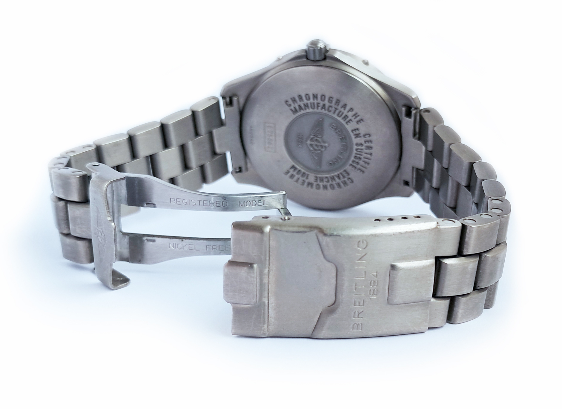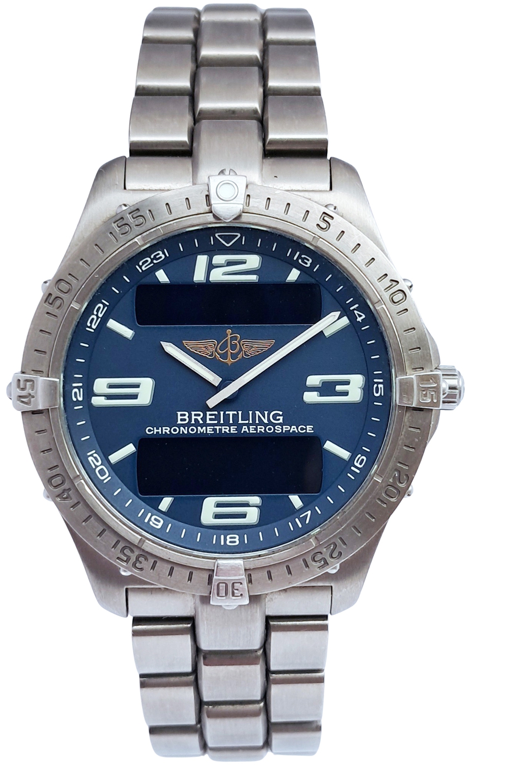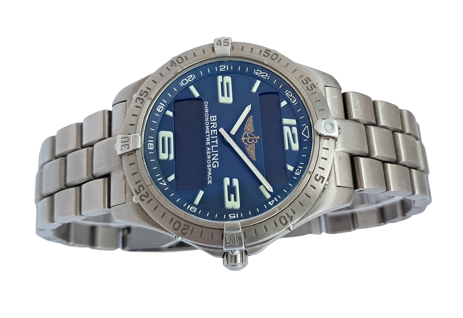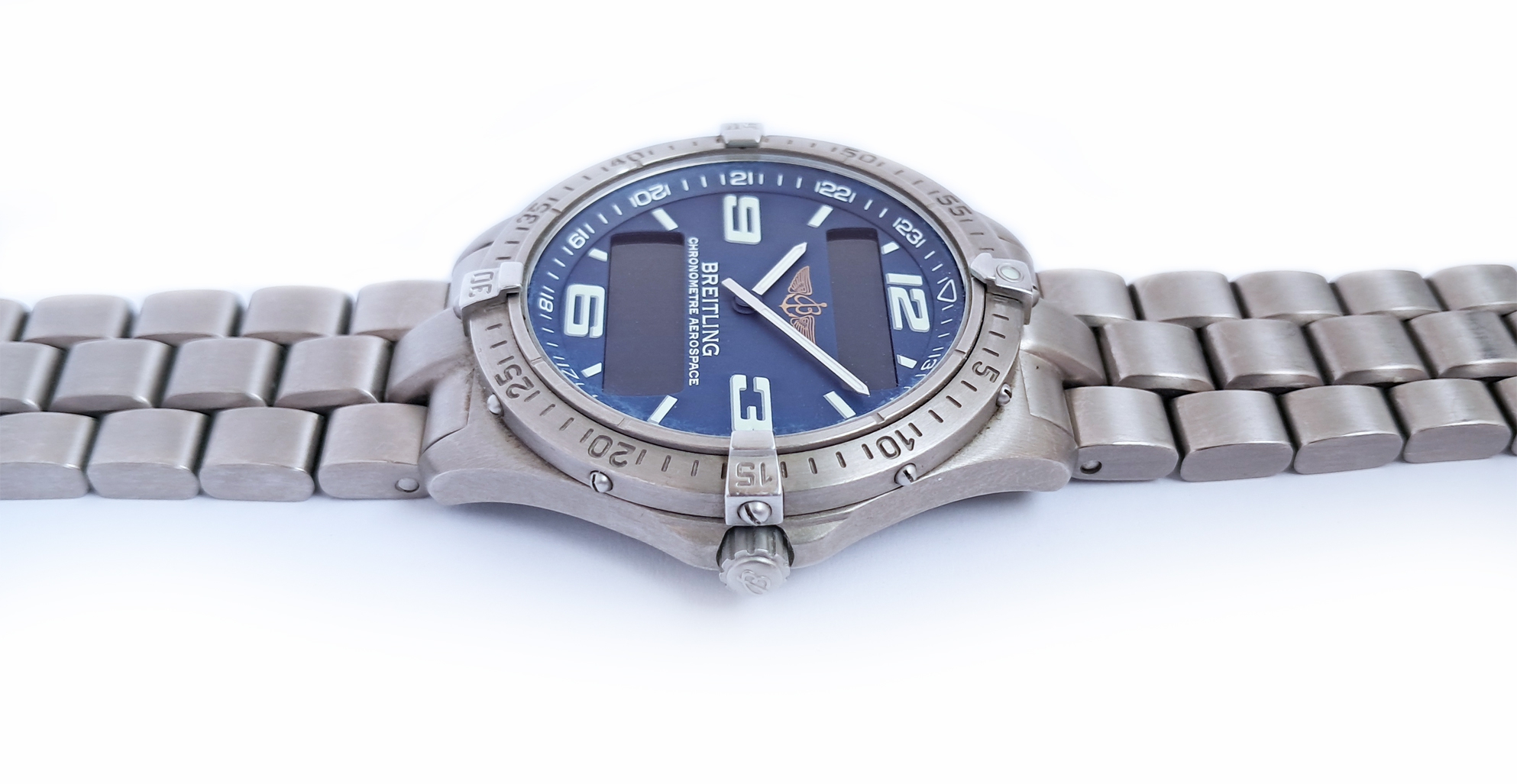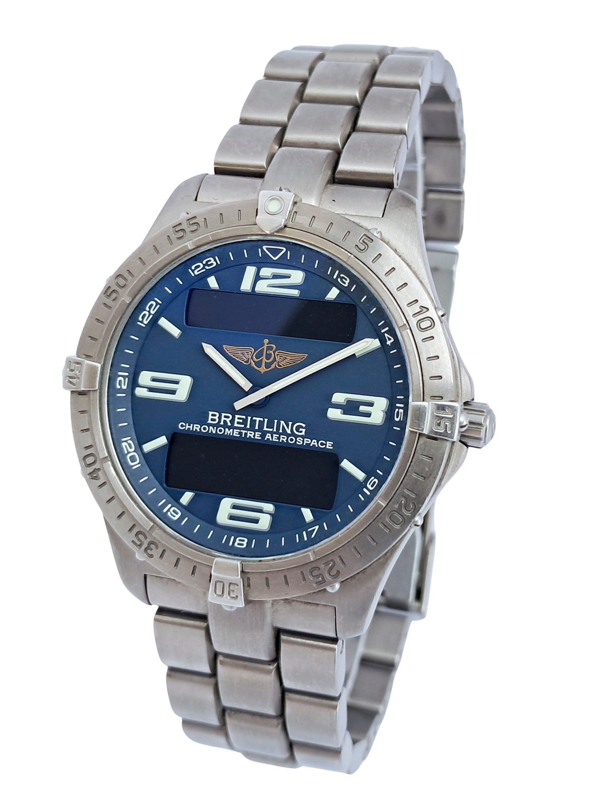 Breitling Chronometre Aerospace analogue and digital wristwatch in titanium. Just had a new battery fitted and working perfectly. The watch is built in titanium. The watch is an officially certified chronometer as indicated by the engraving on the back of the watch. It is a simple watch to use and all of the functions are carried out by the use of the crown. It has a wide range of functions, chronograph, alarm, timer, second time zone, date and day of the week. It’s large LCD digital read out and legible hands keep the Aerospace perfectly and instantly legible under all circumstances. The case is made of titanium which is strong, durable and light in weight. Being in titanium it is also impervious to corrosion and non conductive allergies. The crystal is sapphire with an anti reflective coating and is unmarked. Comes with Breitling travel case and polishing cloth.