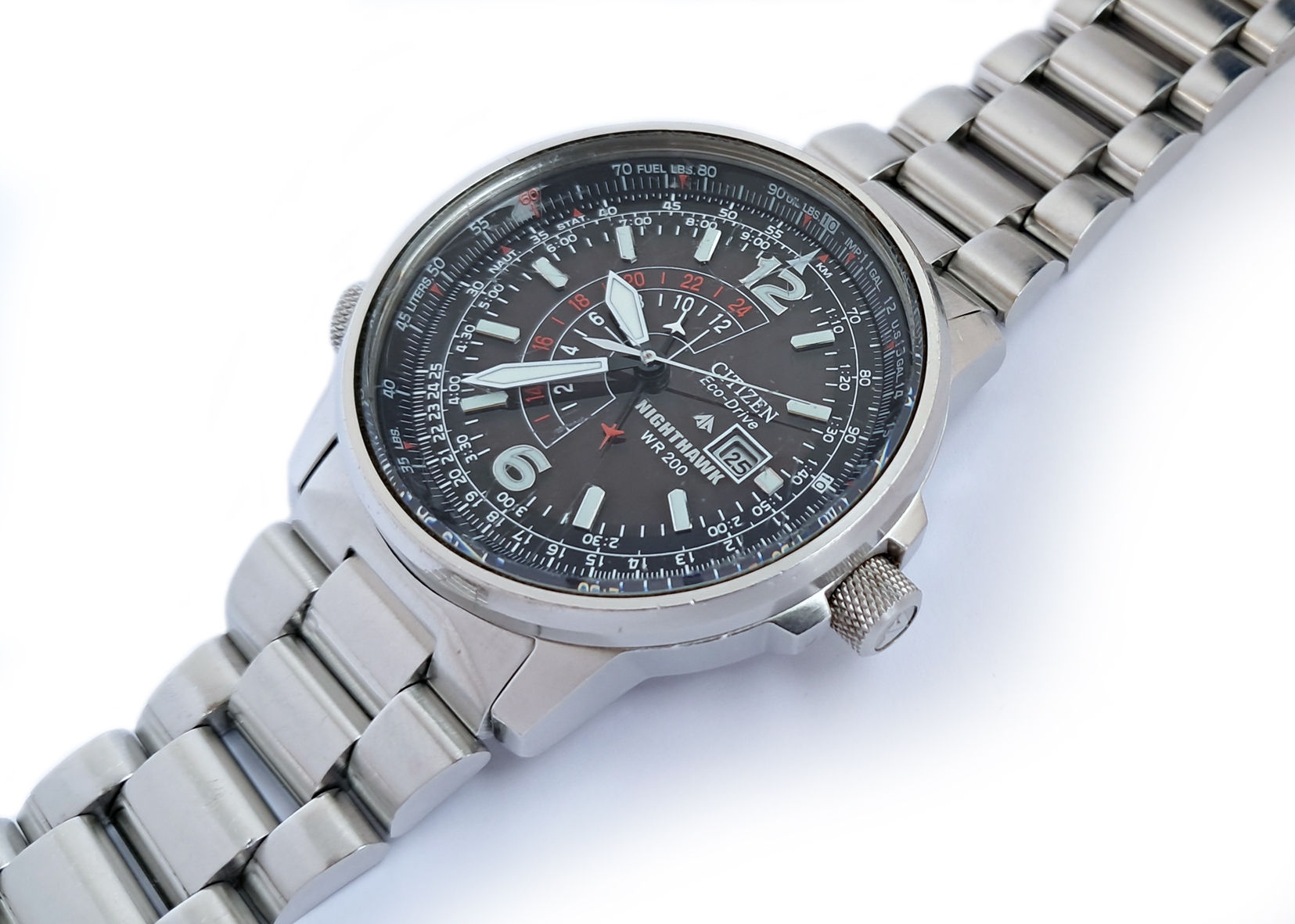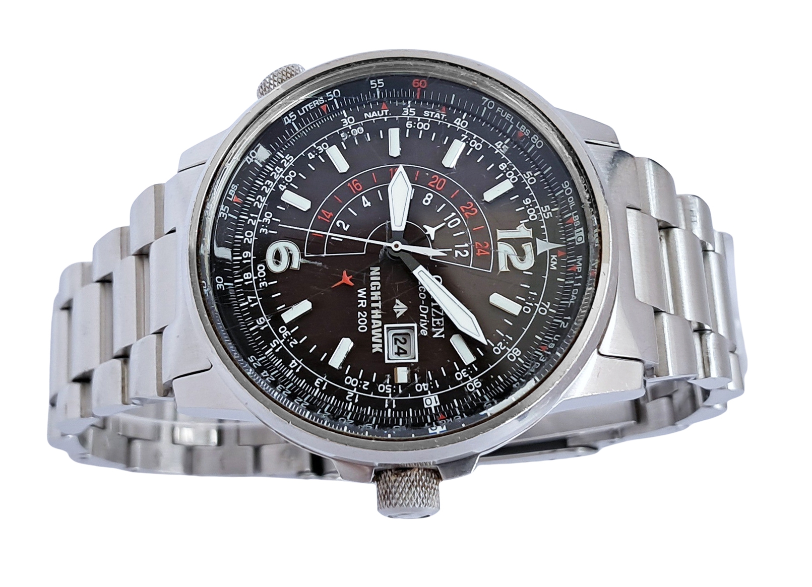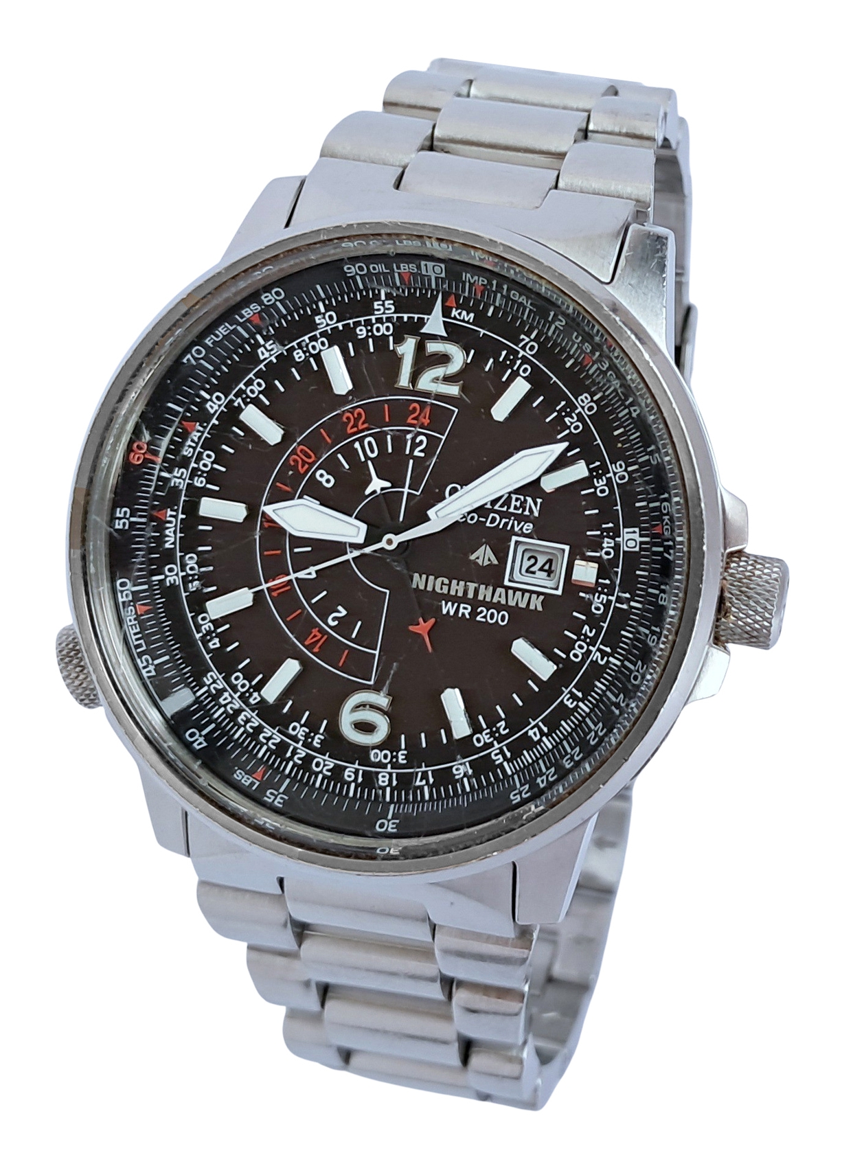 Citizen Nighthawk Eco Drive. Pre owned average condition with some marks to the bracelet and crystal. Stainless steel case with a stainless steel bracelet. Inner rotating slide rule bezel. Black dial with luminous hands and index hour markers. Arabic numerals mark the 6 and 12 positions. Tachymeter around the outer rim. Dial Type: Analog. Luminescent hands and markers. Date display at the 3 o'clock position. Eco-Drive B877 eco-drive movement which works off solar power and does not need a battery replacement. Screw down crown. Solid case back. Deployment clasp with a double push button release. Water resistant at 200 meters / 660 feet. Sport watch style, comes on fabric strap with deployant clasp, all original. Made in Japan, outstanding value for money watch.