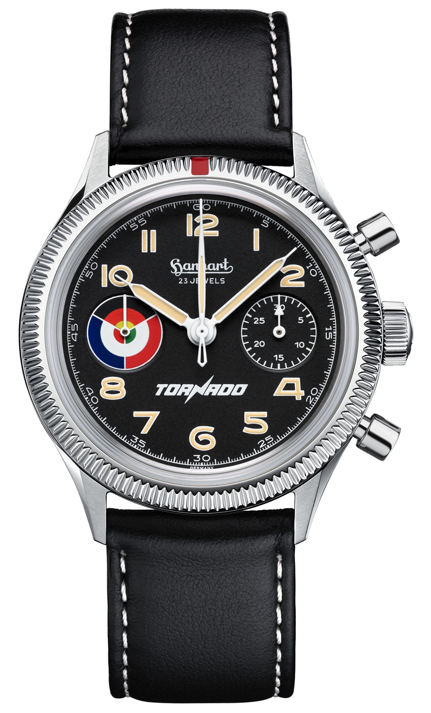A special limited edition for the 50th anniversary hand winding chronograph. August 2024 will mark the 50th anniversary of the maiden flight of the Tornado. To mark this occasion, Hanhart, in collaboration with PANAVIA Aircraft GmbH, is launching a special edition limited to 148 pieces. The number of pieces is based on the day and month of the maiden flight on 14 August.