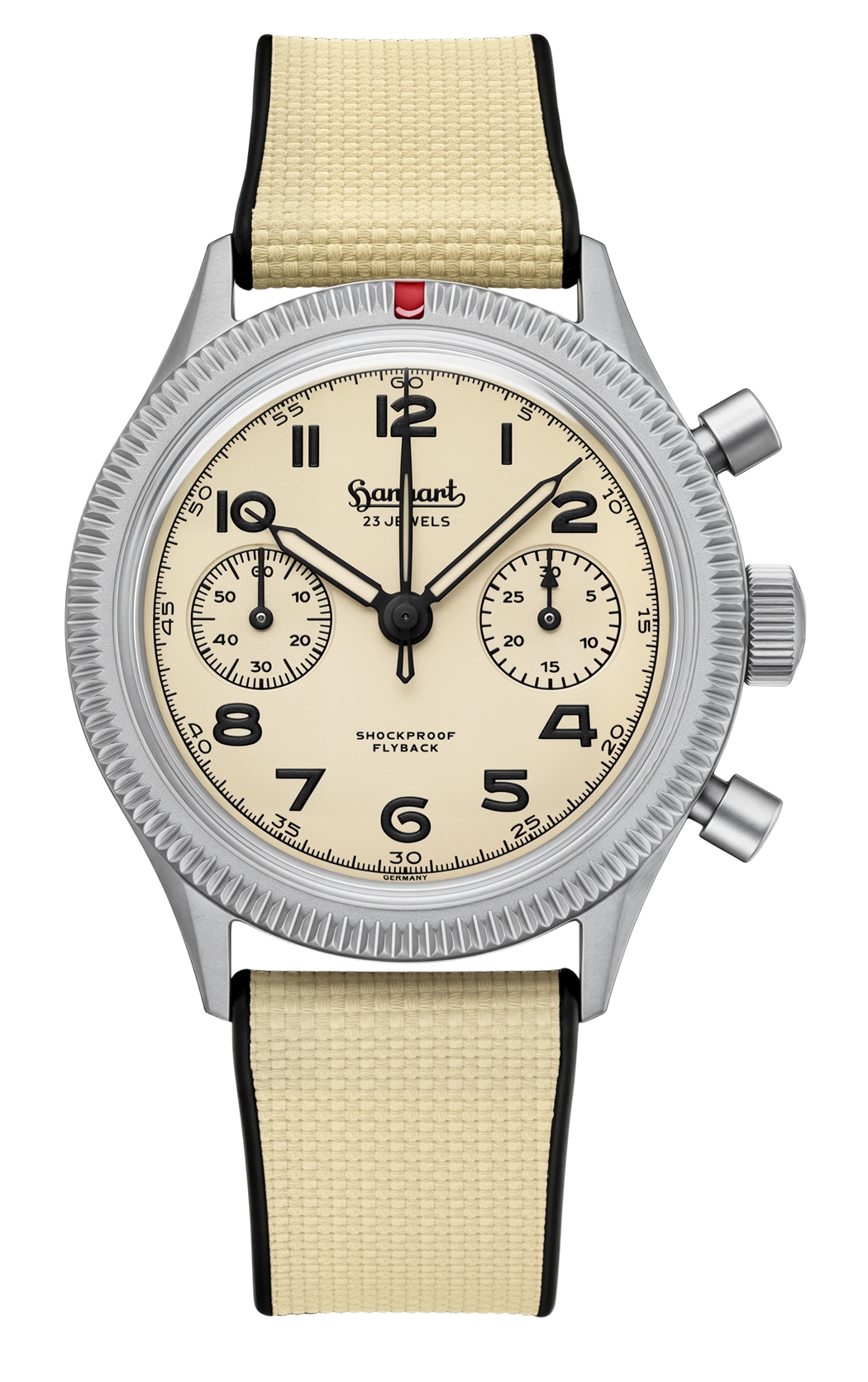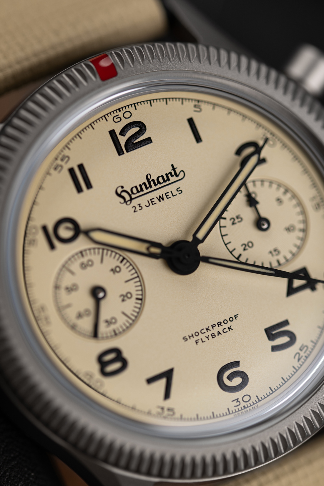 A defining design element remains the fluted bezel, which can be rotated continuously in both directions and, with its characteristic red insert, references an unmistakable Hanhart detail. It combines functional tradition with high everyday usability and enables flexible time measurement under a wide variety of conditions. As an instrument consistently designed for robustness, the chronograph also features the special Hanhart shock protection system, which additionally safeguards the movement against impacts and ensures reliability even during dynamic use.
