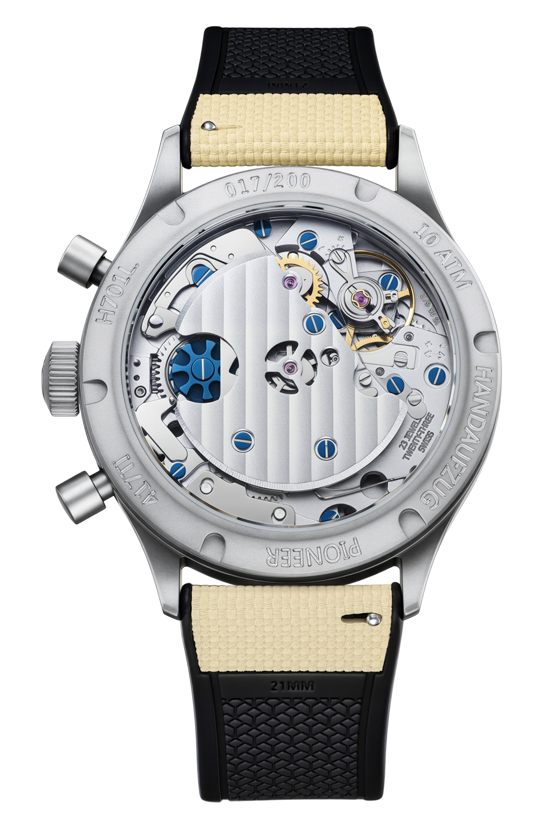 The inspiration for the 417 TI Desert Pilot Limited Edition is rooted not only in the history of the classic 417 ES, but also in one of the most distinctive watches in the modern collection: the PRIMUS Desert Pilot. This robust chronograph was introduced as a contemporary interpretation of legendary pilot watches and combines traditional Hanhart design features with an independent, sporty aesthetic. Characteristic elements include the sand-colored dial, the matte sandblasted case and the coarsely woven textile strap — elements that place the desert at the center not only thematically but functionally.