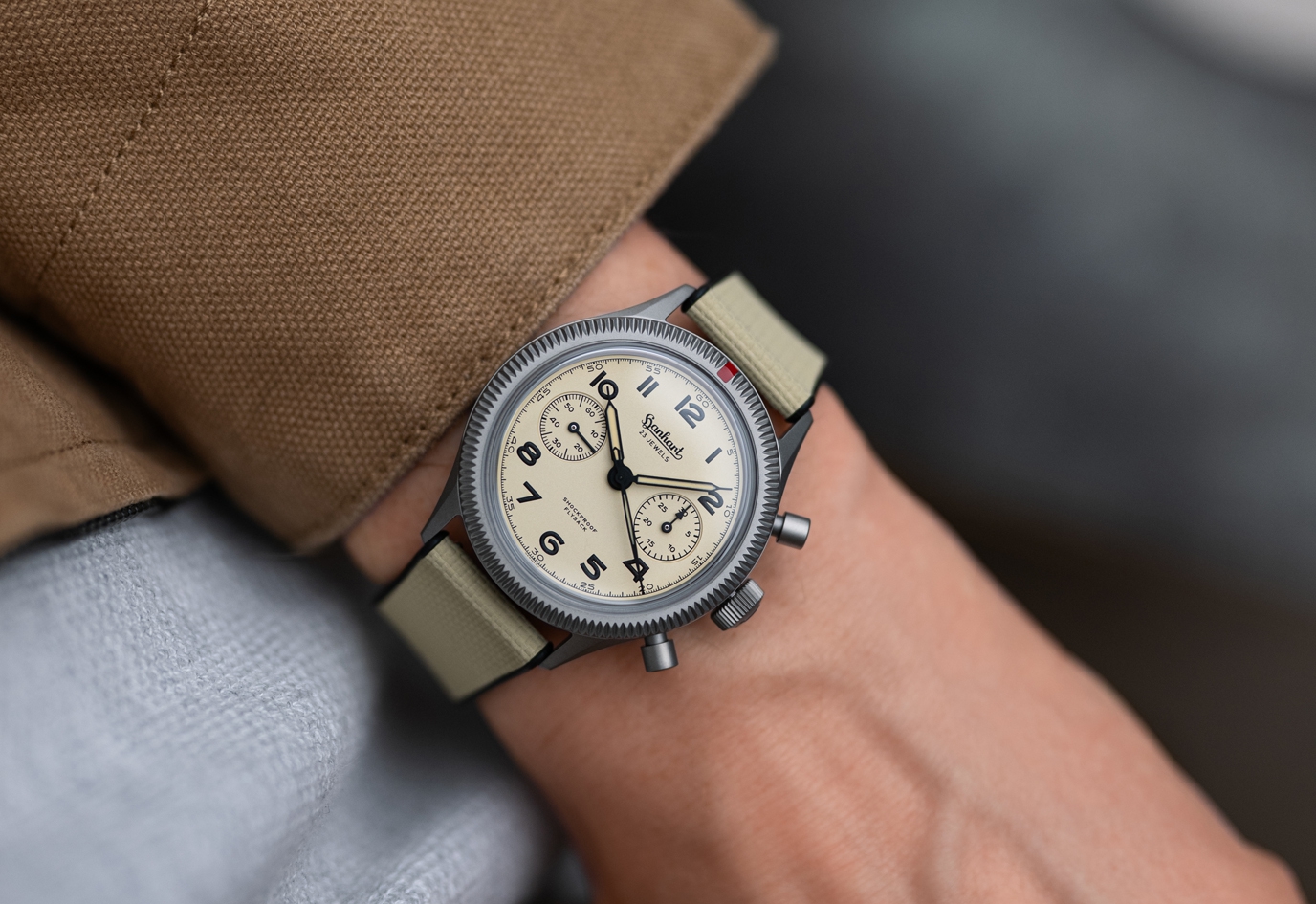 Hanhart 417 TI Desert Pilot 39 mm Limited Edition on Sand Strap