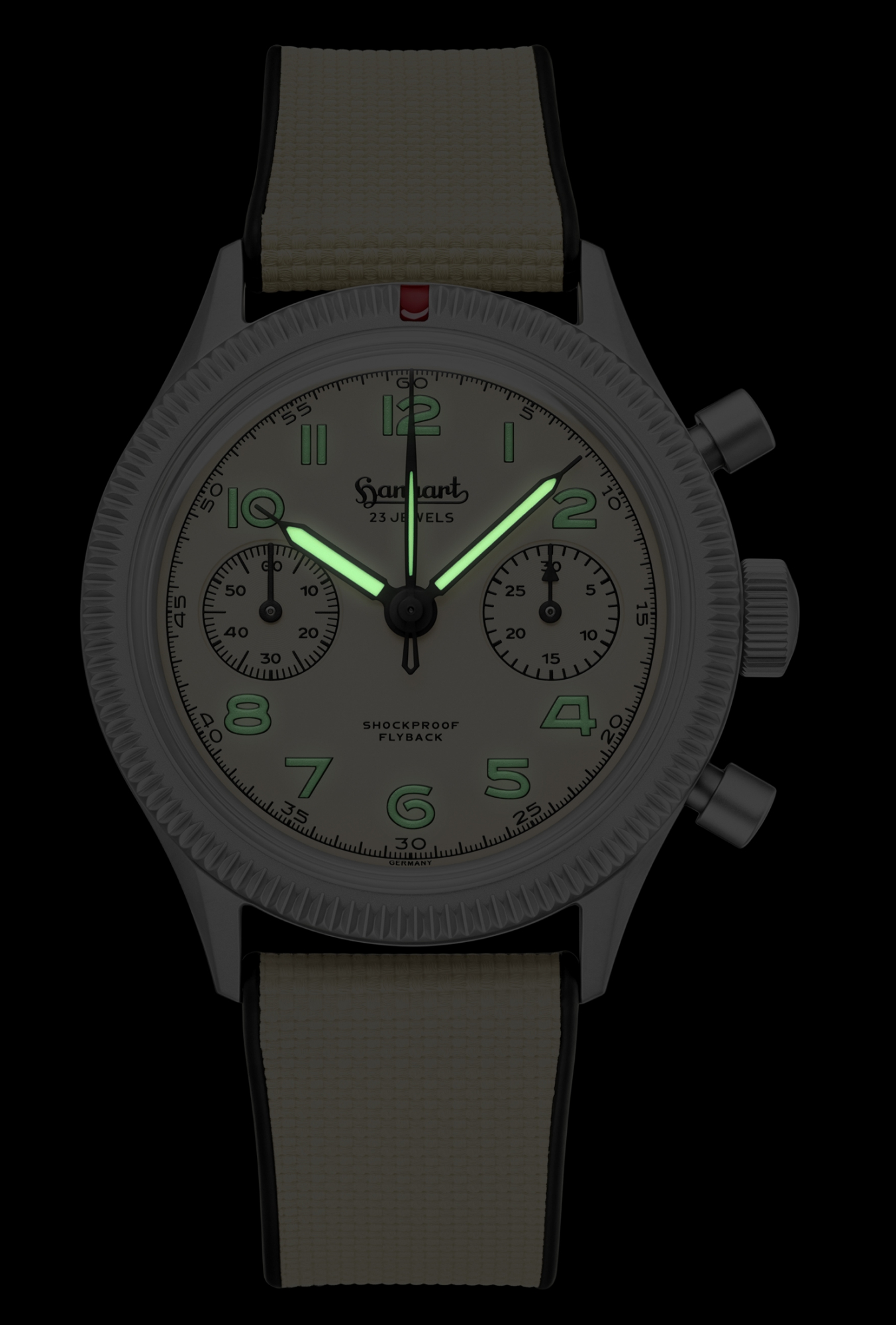 A defining design element remains the fluted bezel, which can be rotated continuously in both directions and, with its characteristic red insert, references an unmistakable Hanhart detail. It combines functional tradition with high everyday usability and enables flexible time measurement under a wide variety of conditions. As an instrument consistently designed for robustness, the chronograph also features the special Hanhart shock protection system, which additionally safeguards the movement against impacts and ensures reliability even during dynamic use.