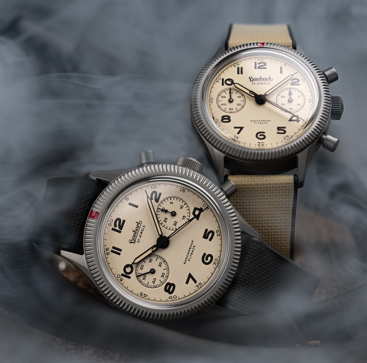 The inspiration for the 417 TI Desert Pilot Limited Edition is rooted not only in the history of the classic 417 ES, but also in one of the most distinctive watches in the modern collection: the PRIMUS Desert Pilot. This robust chronograph was introduced as a contemporary interpretation of legendary pilot watches and combines traditional Hanhart design features with an independent, sporty aesthetic. Characteristic elements include the sand-colored dial, the matte sandblasted case and the coarsely woven textile strap — elements that place the desert at the center not only thematically but functionally.