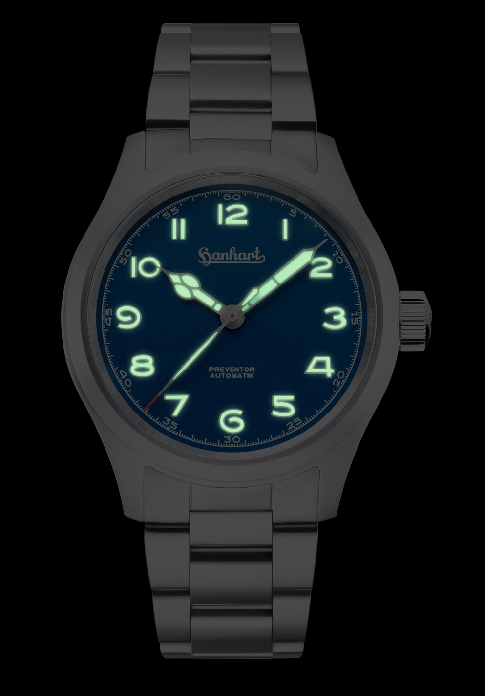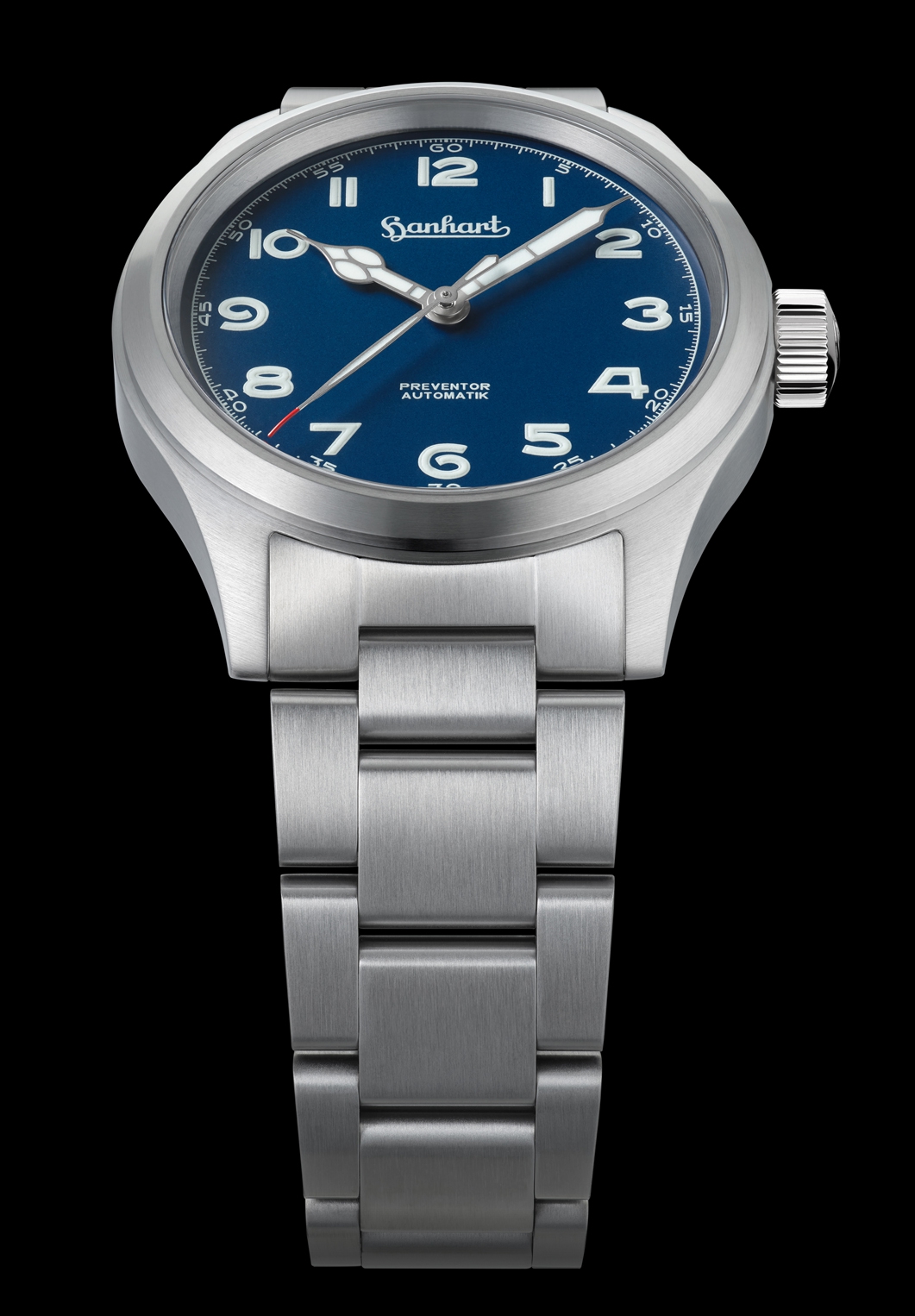 The Preventor HD12™ impresses with its clearly designed dial, which is available in the colours dark blue and black. It has three central hands, with the second hand having a distinctive red tip that enables precise reading. The minute and second hands are curved at the end to avoid parallax errors. Both the numerals and the hands are coated with SuperLuminova® C1, which makes them glow in the dark and ensures optimum legibility at all times. The dial also bears the historic Hanhart logo to emphasise the historical background. The watch has a diameter of 39 mm, a height of 10.5 mm and is powered by the reliable Sellita SW200 automatic movement. The crown features the historical Hanhart ‘h’ and highlights the love of detail