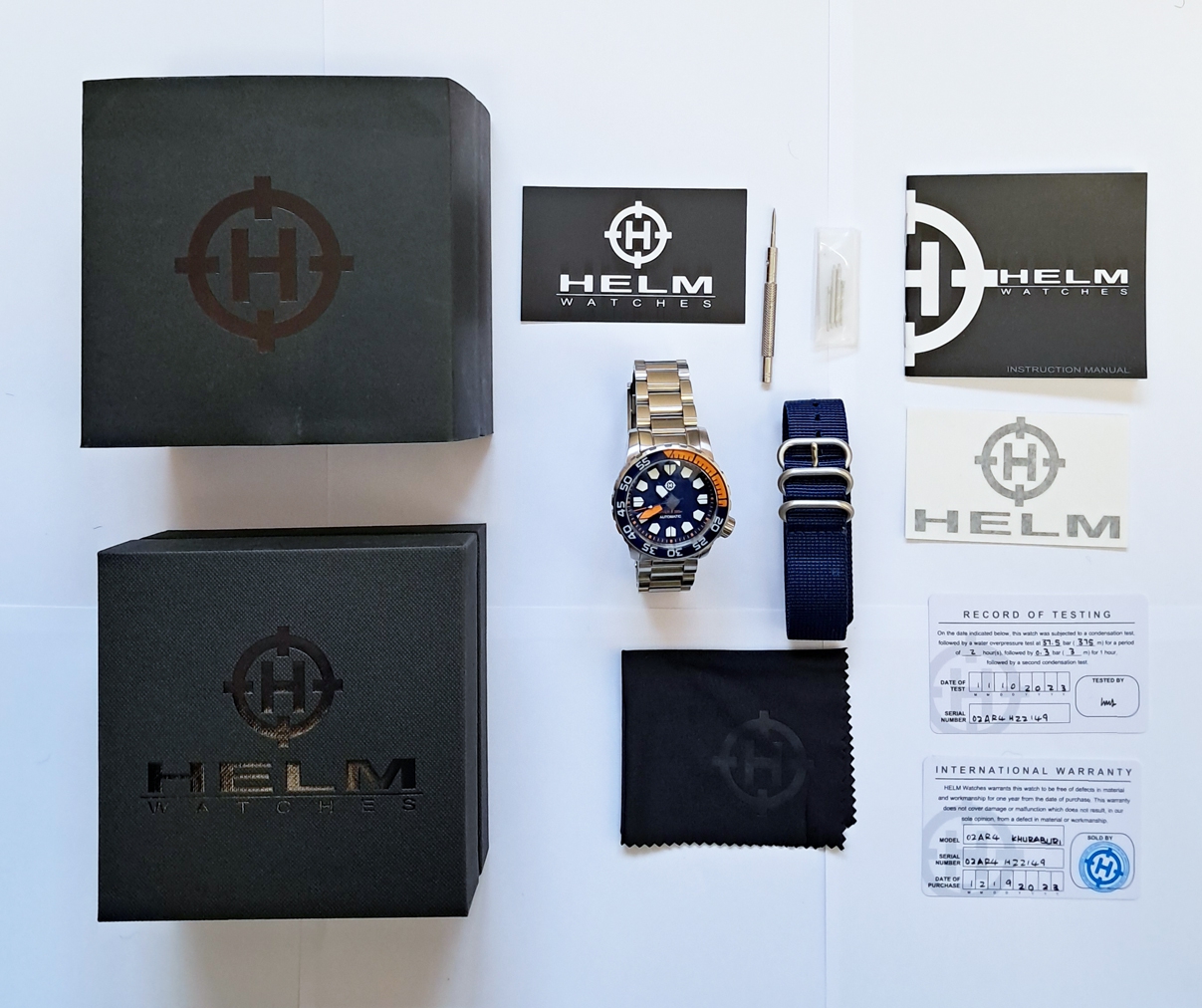 Helm Khuraburi automatic divers watch in stainless steel. It is in mint condition, had very little use and comes with box, papers and spare textile strap. Named for the coastal town in southern Thailand that's just a boat ride away from the Surin Islands and some of the best diving in the Andaman Sea, the HELM Khuraburi begs to visit far flung destinations. Featuring a 316L stainless steel case and robust bracelet, automatic movement, screw-down caseback and crown, sapphire crystal, luminous sapphire bezel, highly legible dial and a 300 meter depth rating, the ISO 6425 compliant Khuraburi is a capable companion on any expedition.