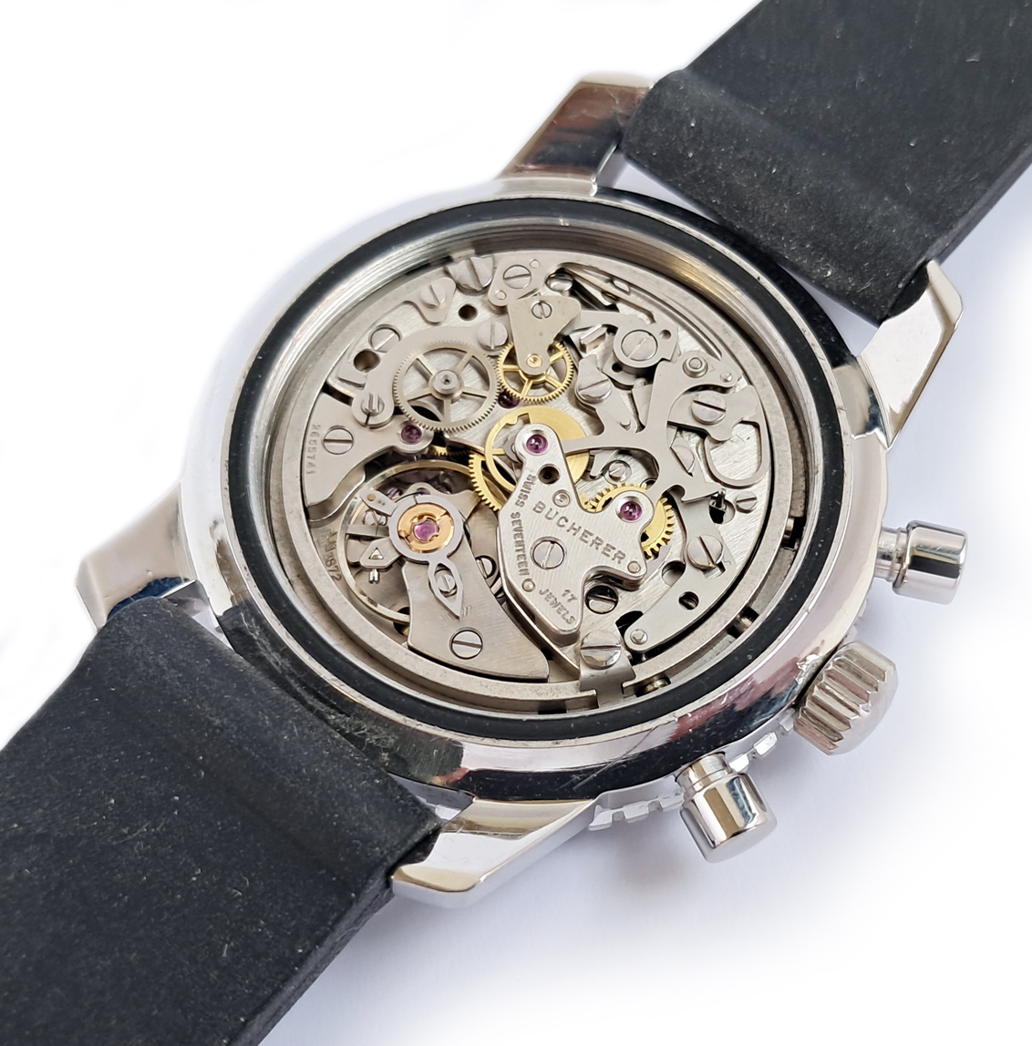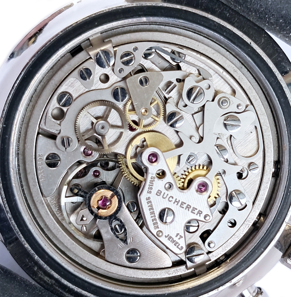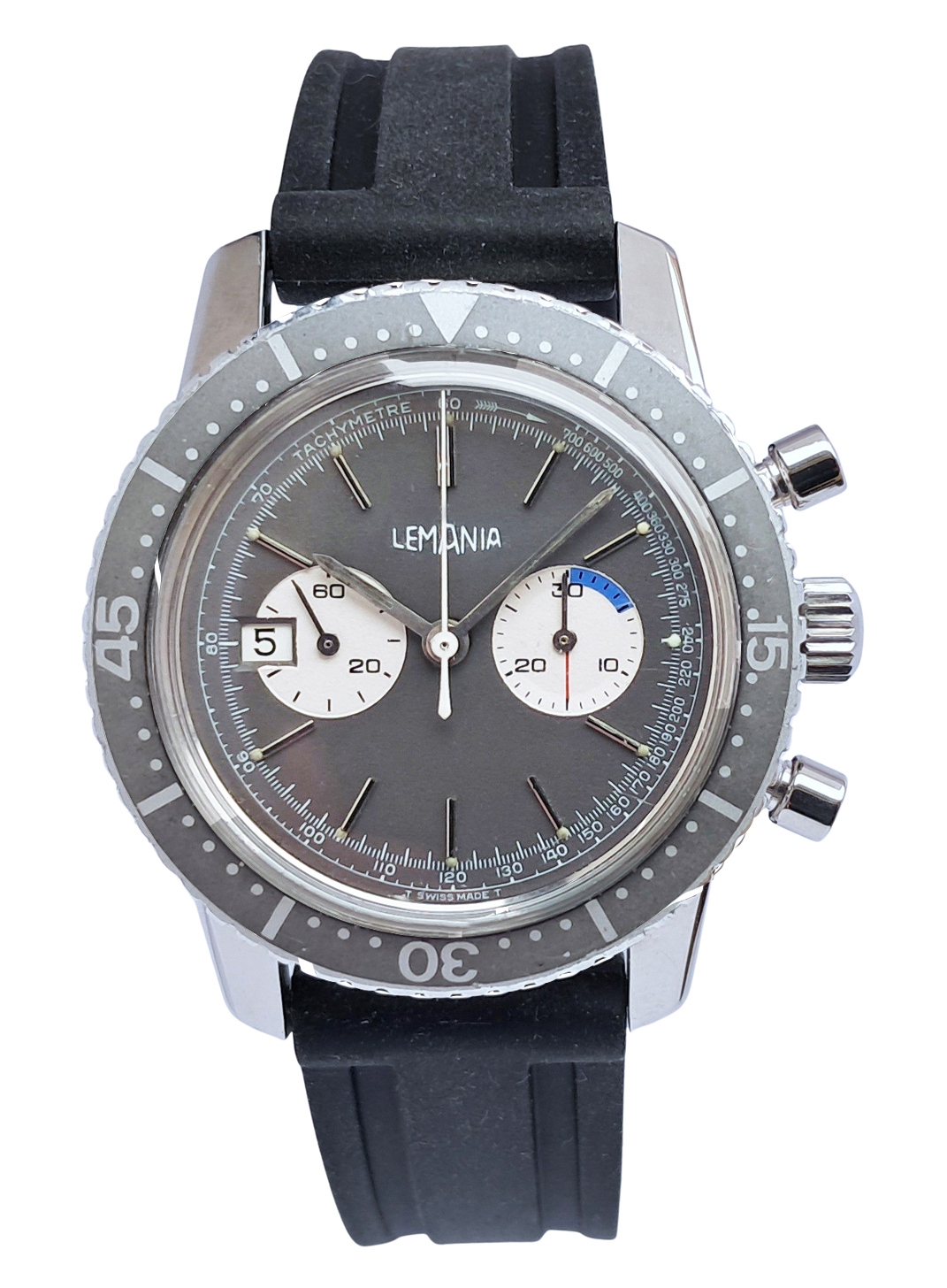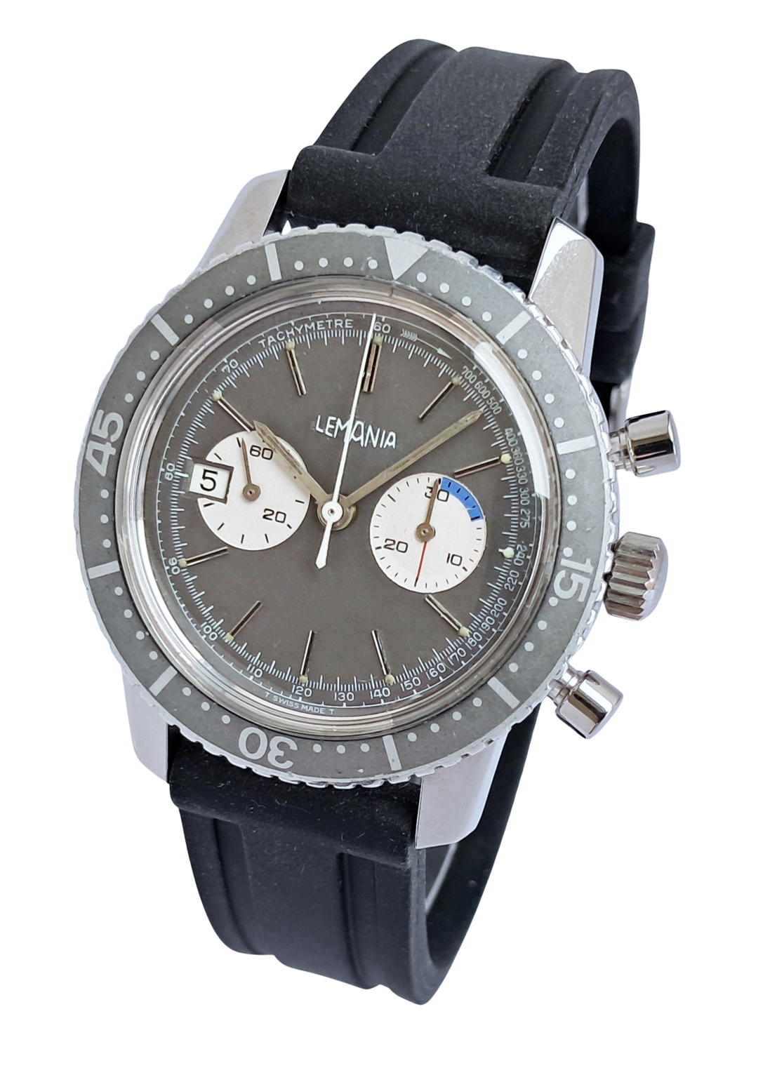 Lemania vintage hand winding chronograph dating to the late 1960’s to early 1970’s. It is in good working order, keeping good time for its age at around 20 seconds per day and all chronograph functions work precisely. It is housed on a stainless steel case with screw on back. It has got a Lemania hand winding movement 1872 but is branded as 3872 and Bucherer. Lemania made movements for many companies including Bucherer as well as more famous brands such as Omega. The calibre 1872 was used in the Omega Speedmaster for over 20 years. This Bucherer branded movement was probably a left over batch that Lemania decided to ues in their own range of watches The dial is a slightly unusual layout with the date window at the 9 position rather than thee usual 3 position.