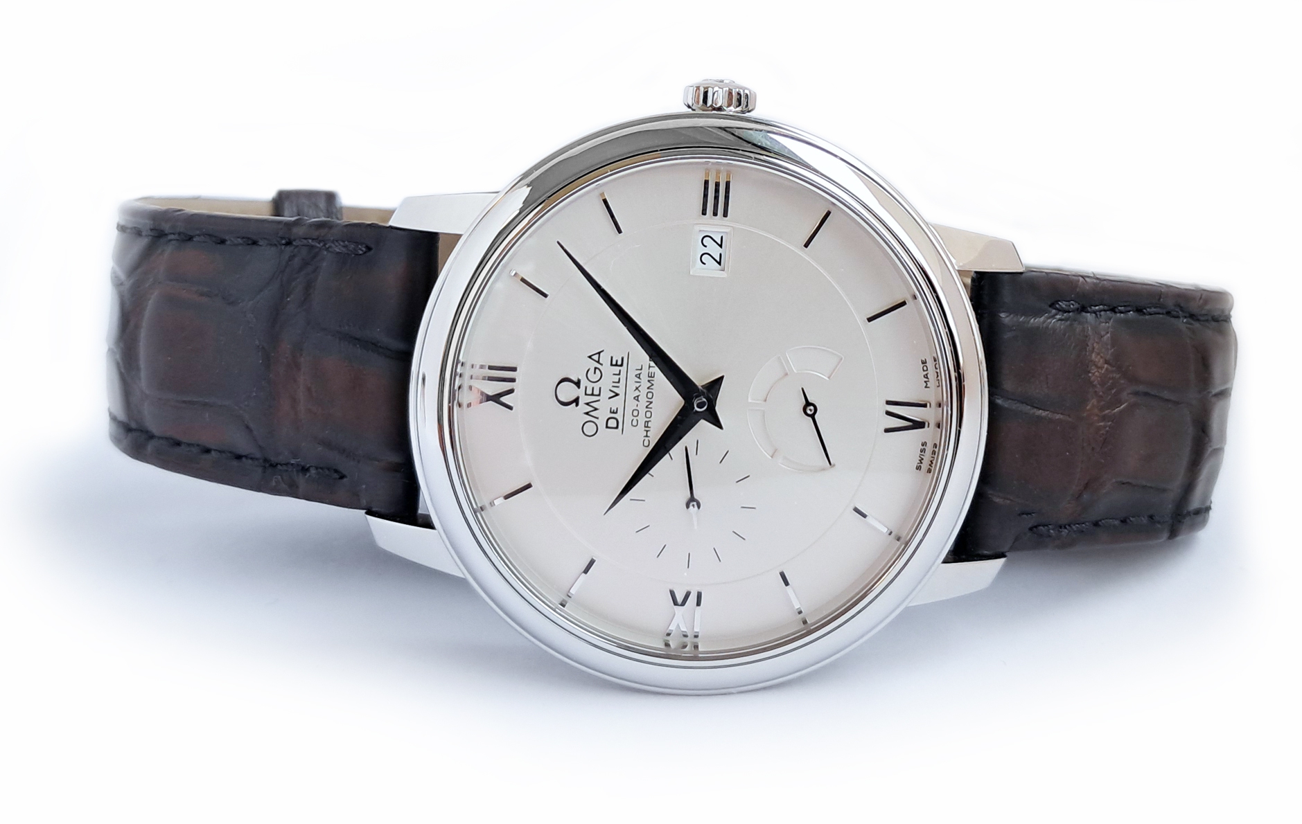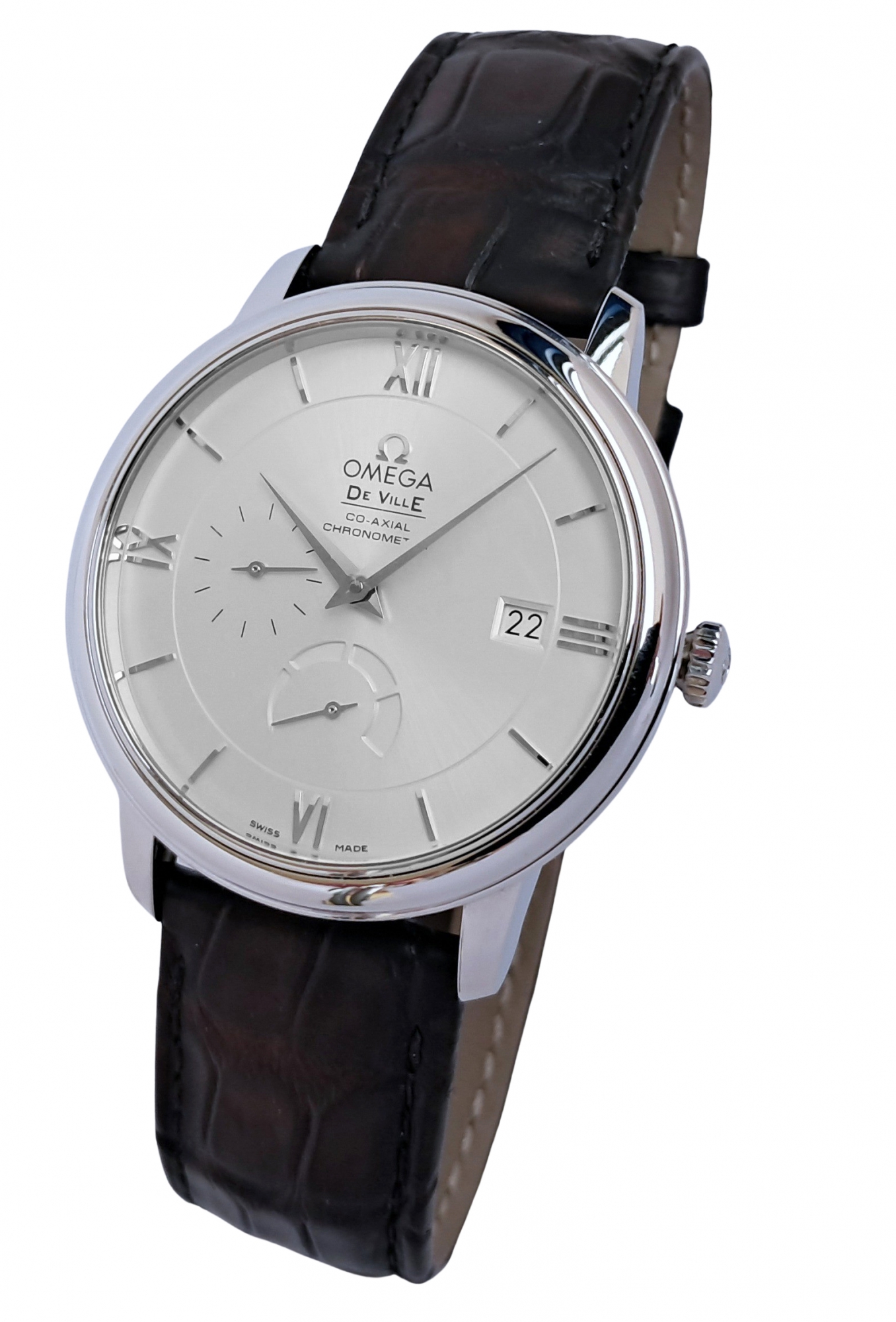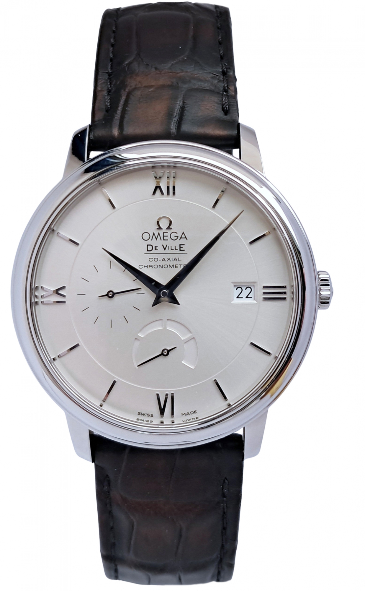 Omega Deville Prestige automatic power reserve chronometer. Whilst pre owned appears to be in mint and barely used condition. The UK retail price is £3800 and it comes complete with box and papers, in the large polished wooden presentation box and original Omega purchase receipt from 2001. The Omega De Ville Prestige collection has attracted a large and loyal following with its classic, elegant design. These timepieces are characterised by pure styling with luxury finishes, and exude a timeless design. This model features a two-zone silver dial with Roman numeral hour indexes. A scratch-resistant sapphire crystal protects this striking dial, decorated with a date window, power reserve indicator and small seconds dial. The watch is a 39.5 mm stainless steel case, and is presented on a black leather strap. This timepiece is powered by the Co-Axial calibre 2627.