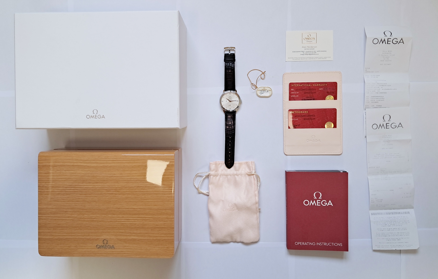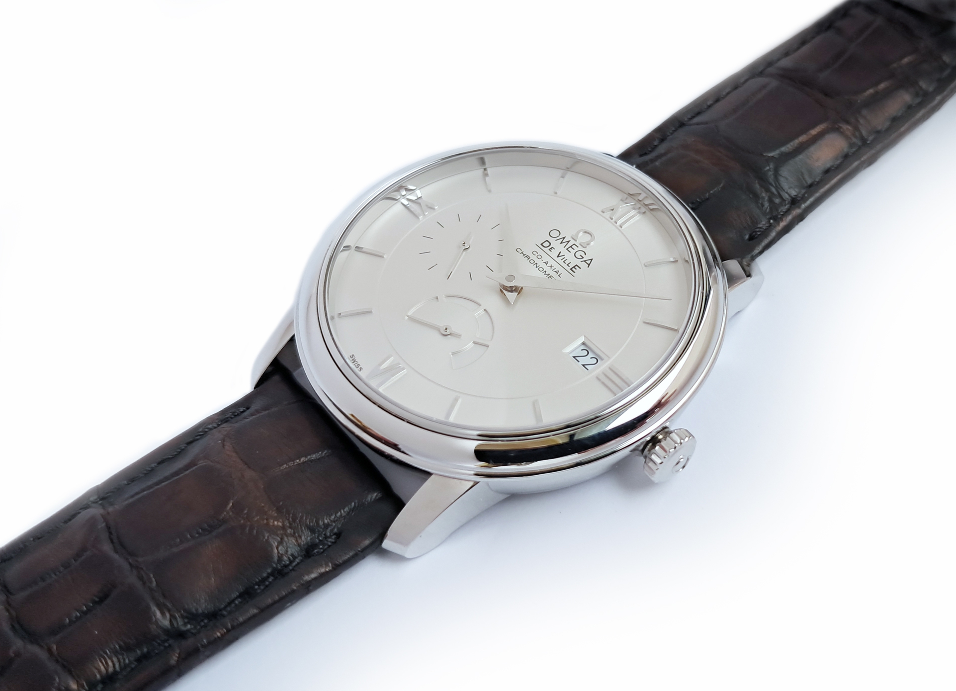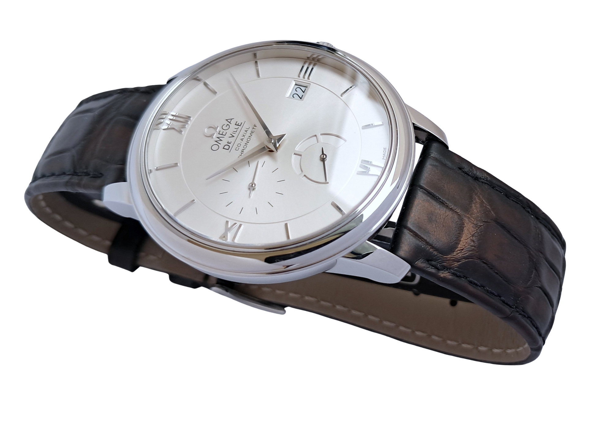 Omega Deville Prestige automatic power reserve chronometer. Whilst pre owned appears to be in mint and barely used condition. The UK retail price is £3800 and it comes complete with box and papers, in the large polished wooden presentation box and original Omega purchase receipt from 2001. The Omega De Ville Prestige collection has attracted a large and loyal following with its classic, elegant design. These timepieces are characterised by pure styling with luxury finishes, and exude a timeless design. This model features a two-zone silver dial with Roman numeral hour indexes. A scratch-resistant sapphire crystal protects this striking dial, decorated with a date window, power reserve indicator and small seconds dial. The watch is a 39.5 mm stainless steel case, and is presented on a black leather strap. This timepiece is powered by the Co-Axial calibre 2627.