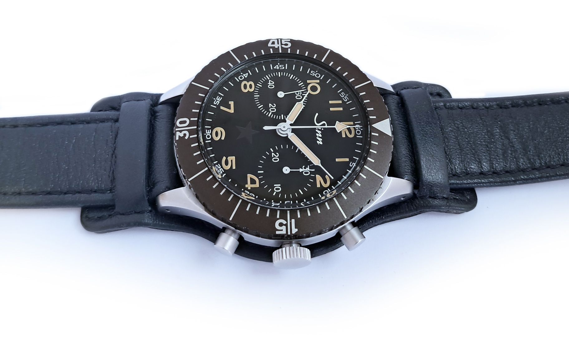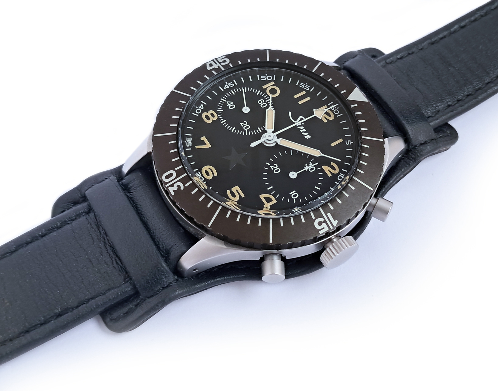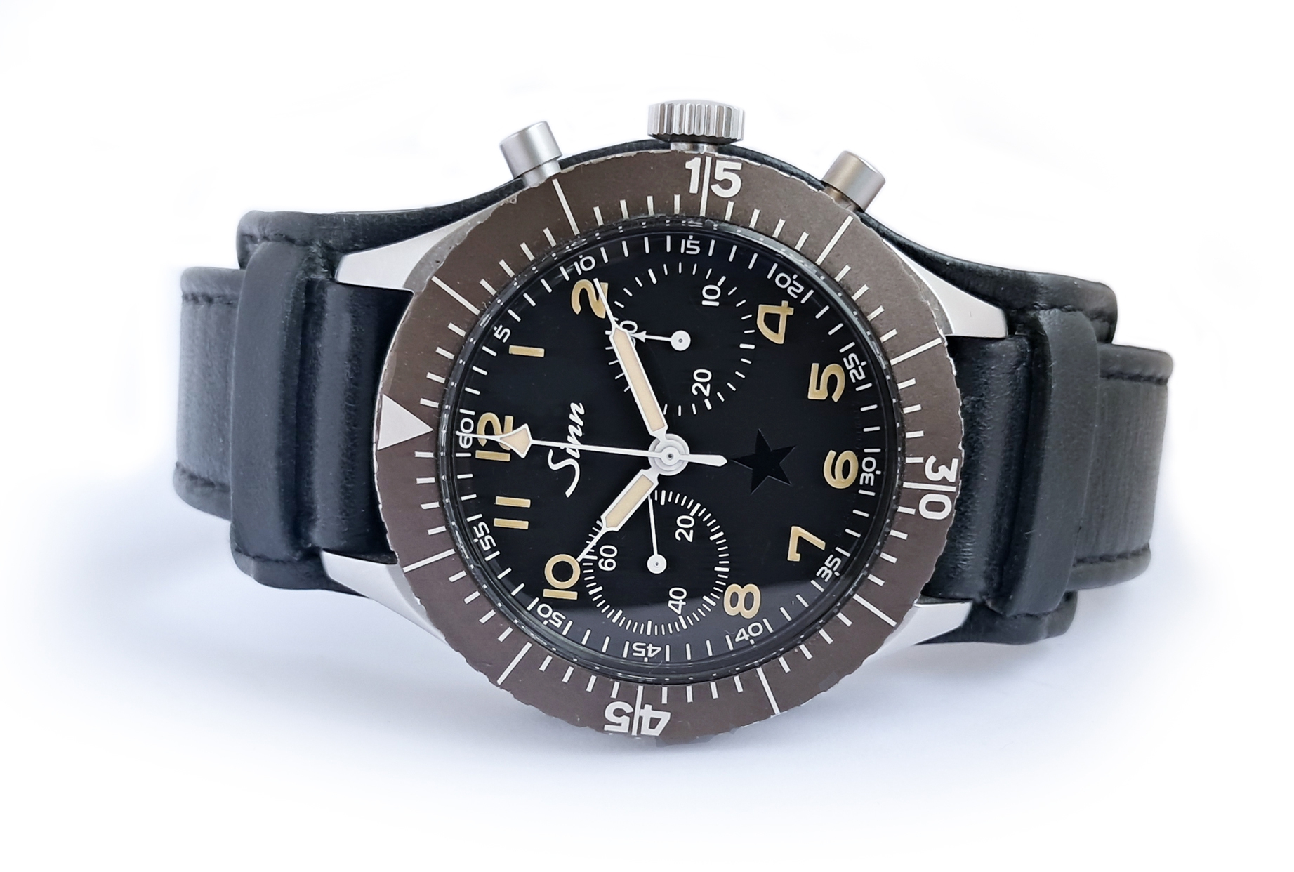 Back then, the company purchased phased-out watches from the inventories of the Bundeswehr (Heuer-Leonidas SA 1550 SG, shortened to Heuer 1550 SG) and sold these after reconditioning with, inter alia, added SINN lettering on the dial under the label ‘Bundeswehr Chronograph for Pilots’ as Model 155 Bw. These impressive pilot watches with flyback function were fitted with a Valjoux 230 handwound chronograph movement and a pilot’s bezel.