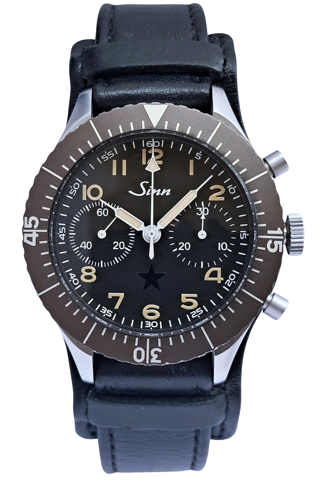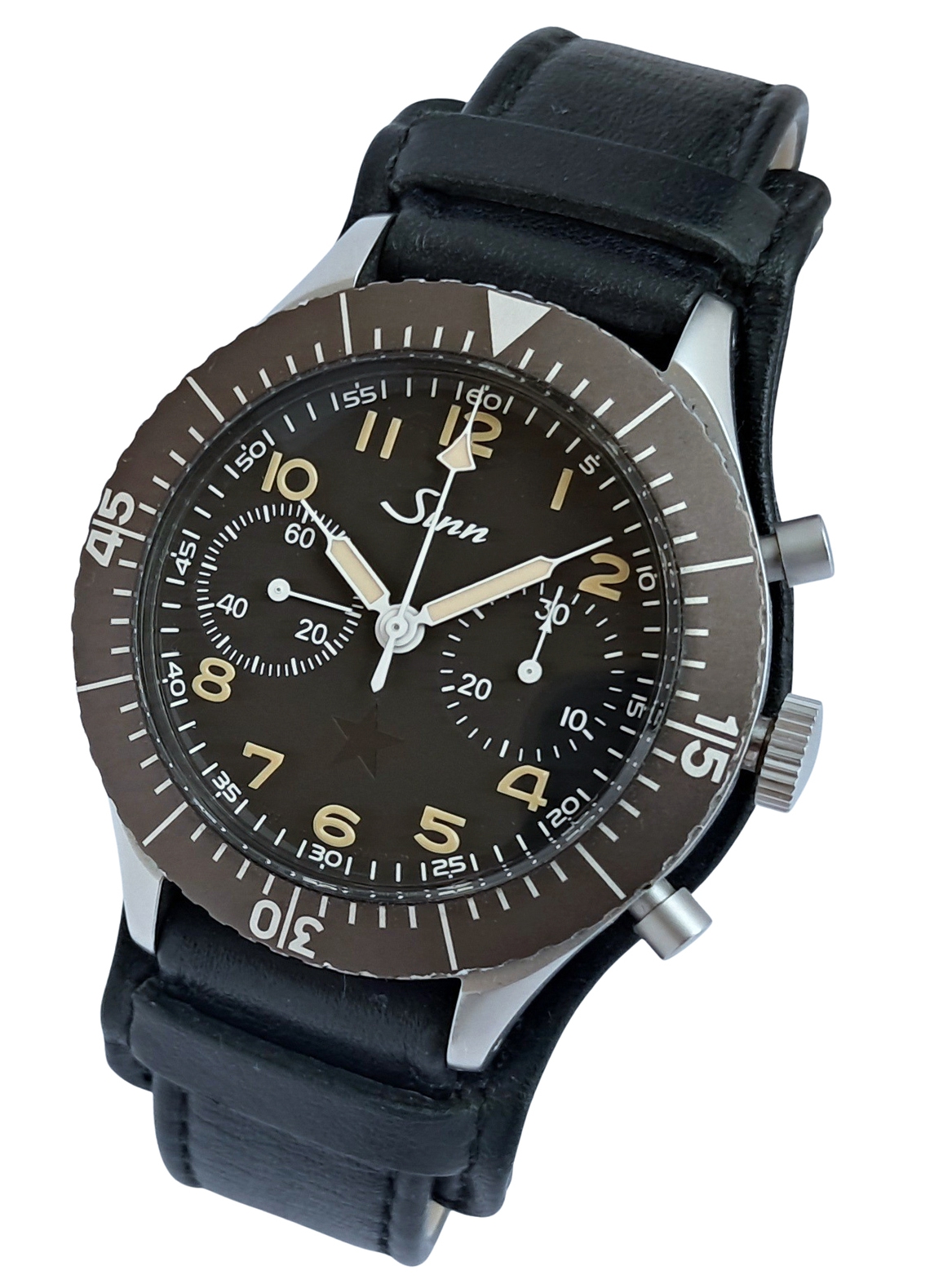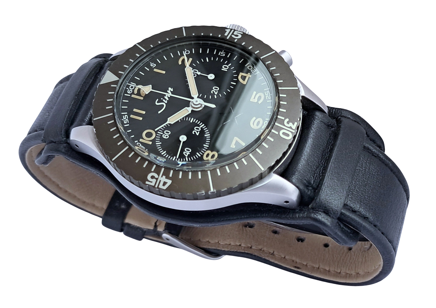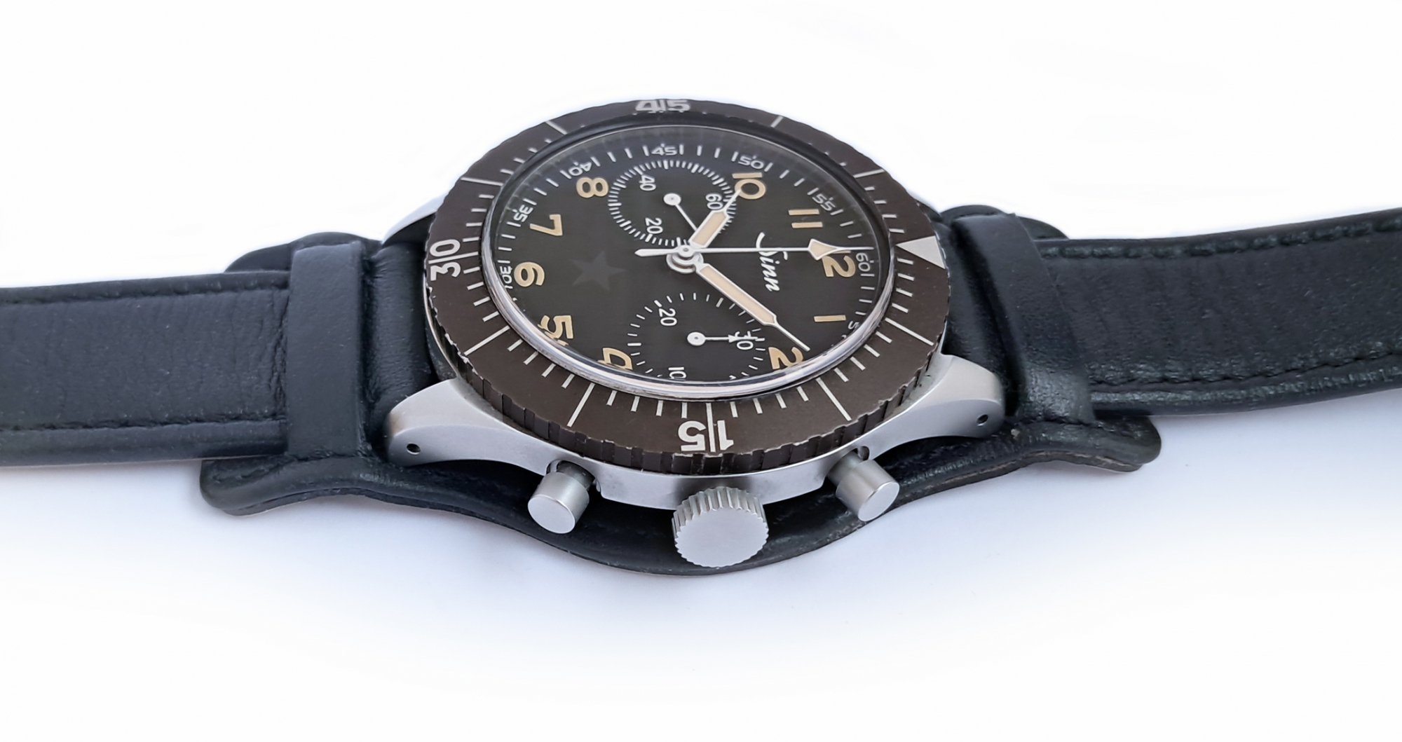 Back then, the company purchased phased-out watches from the inventories of the Bundeswehr (Heuer-Leonidas SA 1550 SG, shortened to Heuer 1550 SG) and sold these after reconditioning with, inter alia, added SINN lettering on the dial under the label ‘Bundeswehr Chronograph for Pilots’ as Model 155 Bw. These impressive pilot watches with flyback function were fitted with a Valjoux 230 handwound chronograph movement and a pilot’s bezel.
