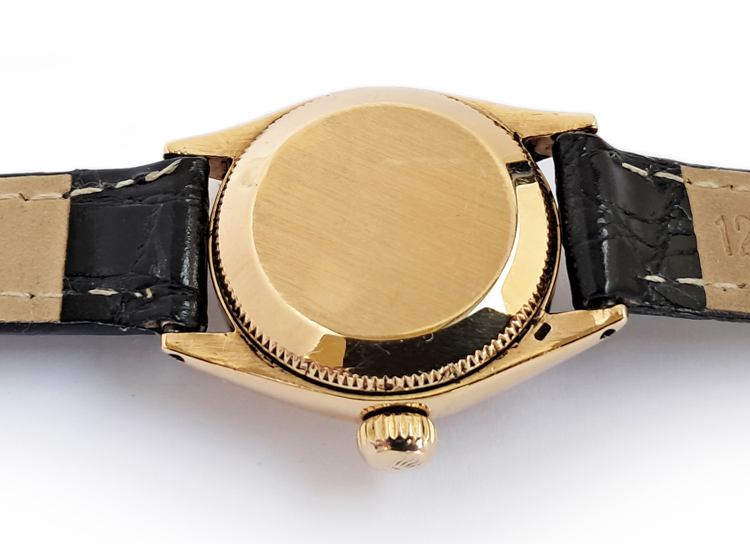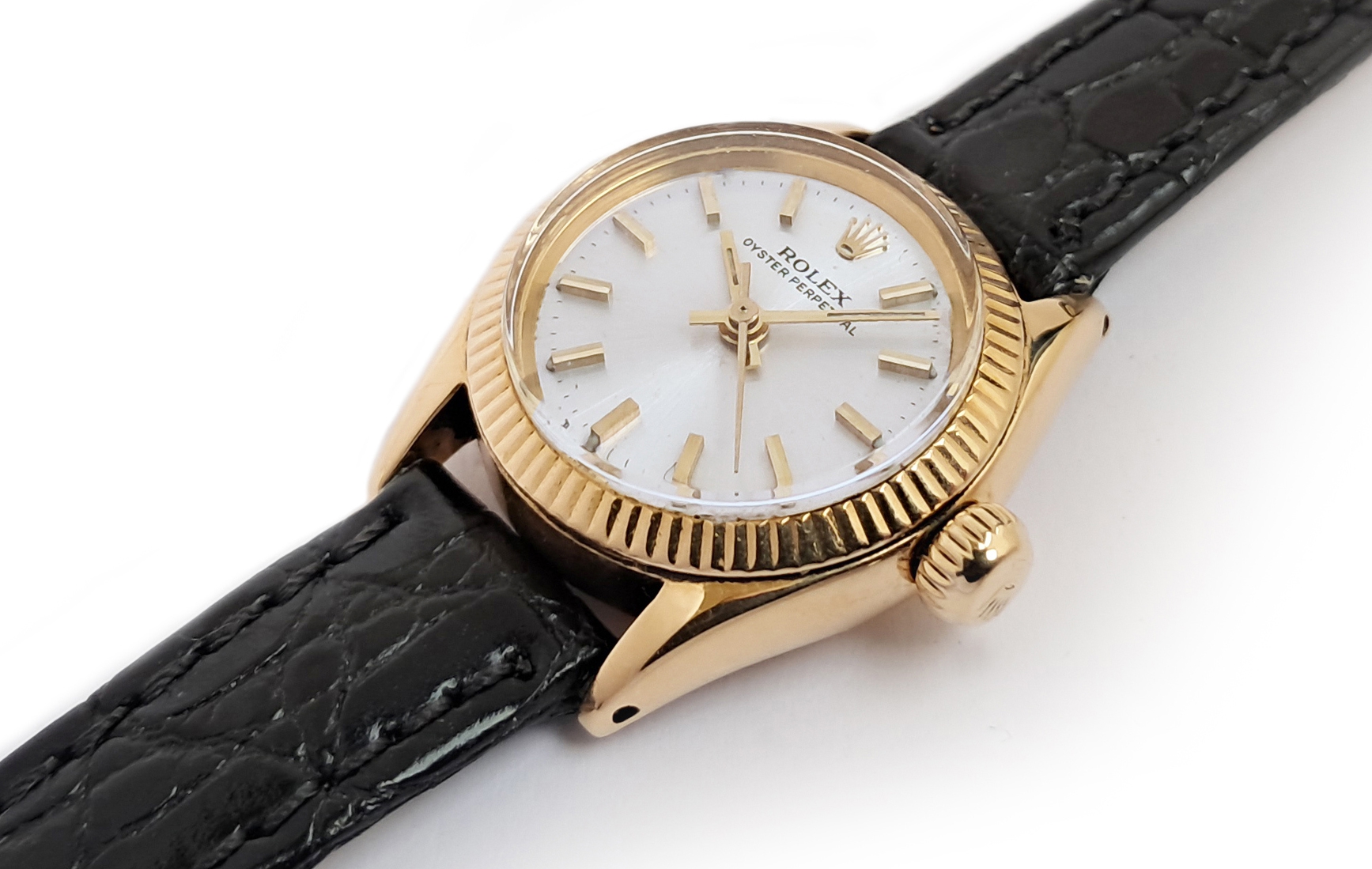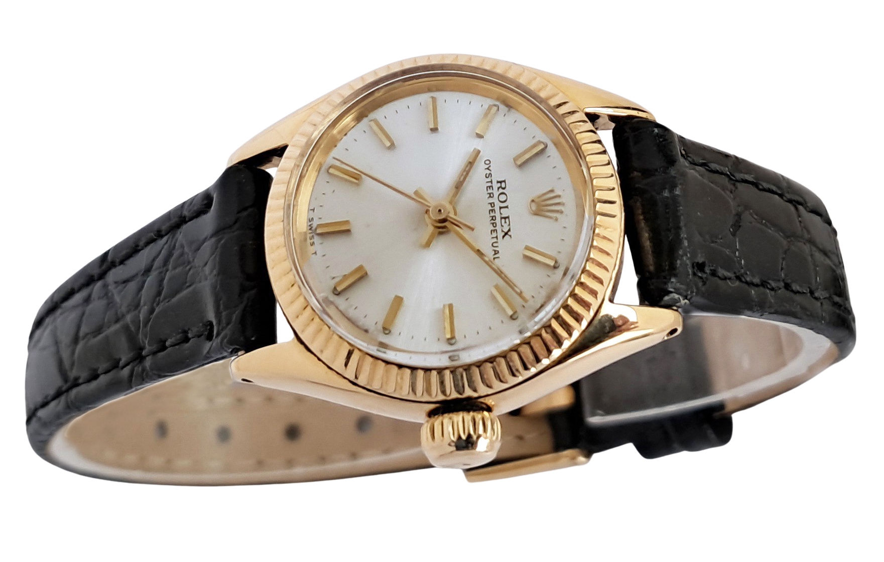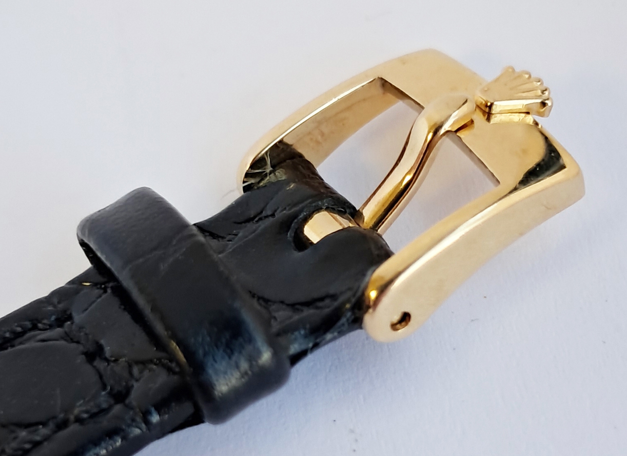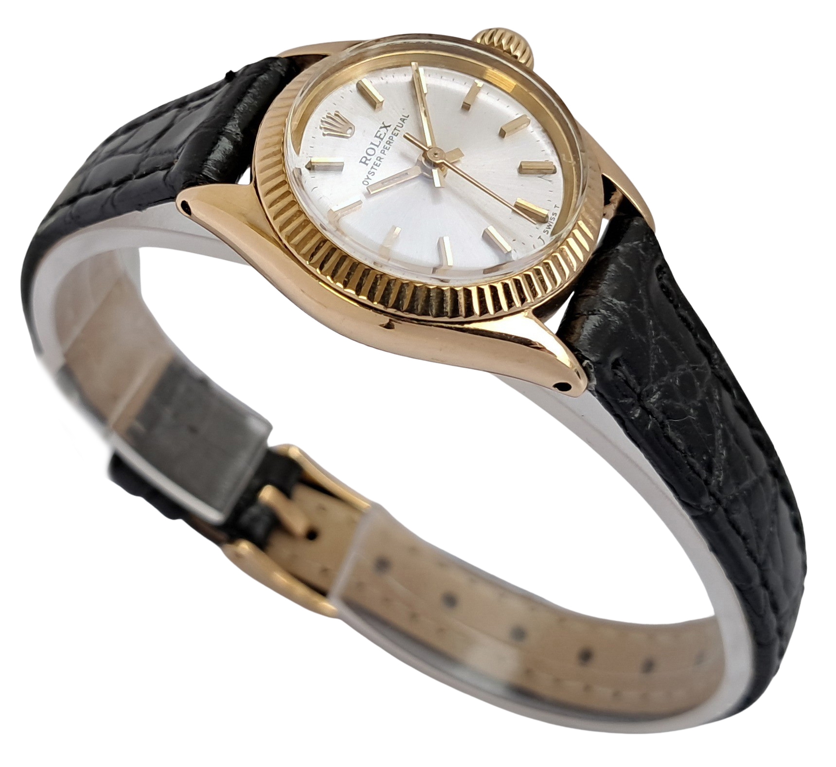Ladies Rolex Oyster Perpetual automatic wristwatch model reference 6619 in 18 karat yellow gold. It has just had a complete service and is in excellent running order. It has a replacement leather strap but has a brand new 18k genuine Rolex buckle. The buckles cost in excess of £500. The bracelet has been scrapped at some point in its life as there is some bracelet rub between the lugs when the strap is removed. This cannot be seen though as the strap hides it. However part of the serial number is eroded due to the bracelet rub so hard to determine the age. It is an acrylic crystal and slightly older style so at a guess late 1960’s to early 1970’s. It is a classic oyster case with screw down crown and fluted 18 karat gold bezel. The crown is signed with the Rolex crown and has a screw on case back. The dial is a pearly silver colour. It is a thick case but still a small ladies classic looking watch. Small dent to case back and some patina to the dial, all visible in the pictures