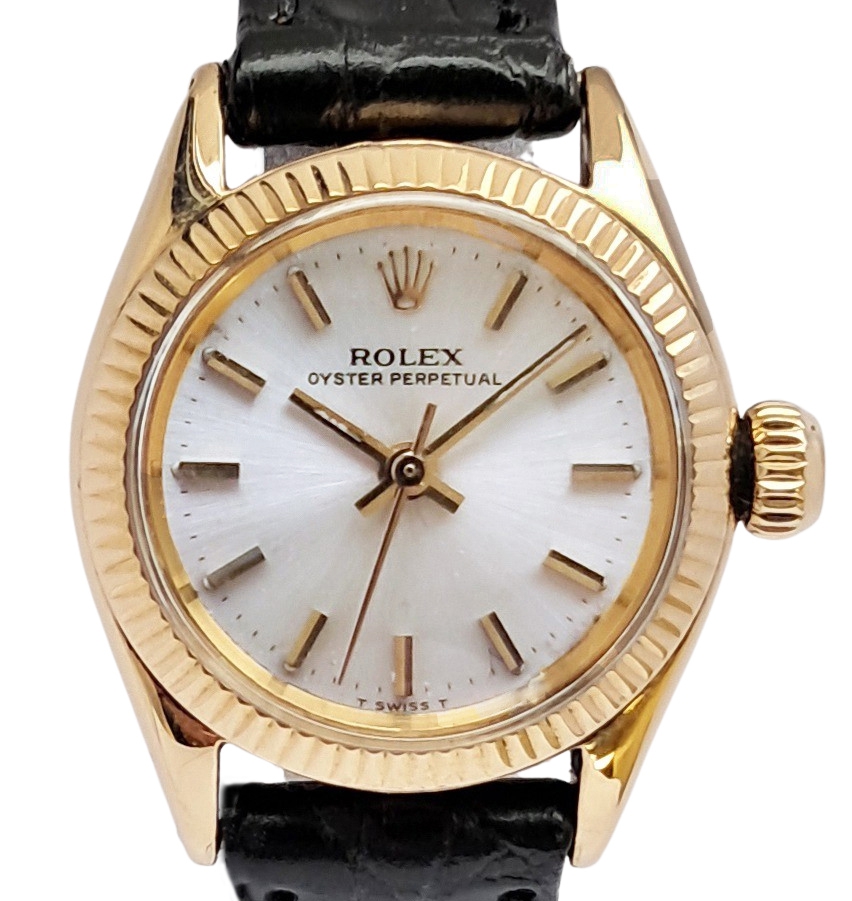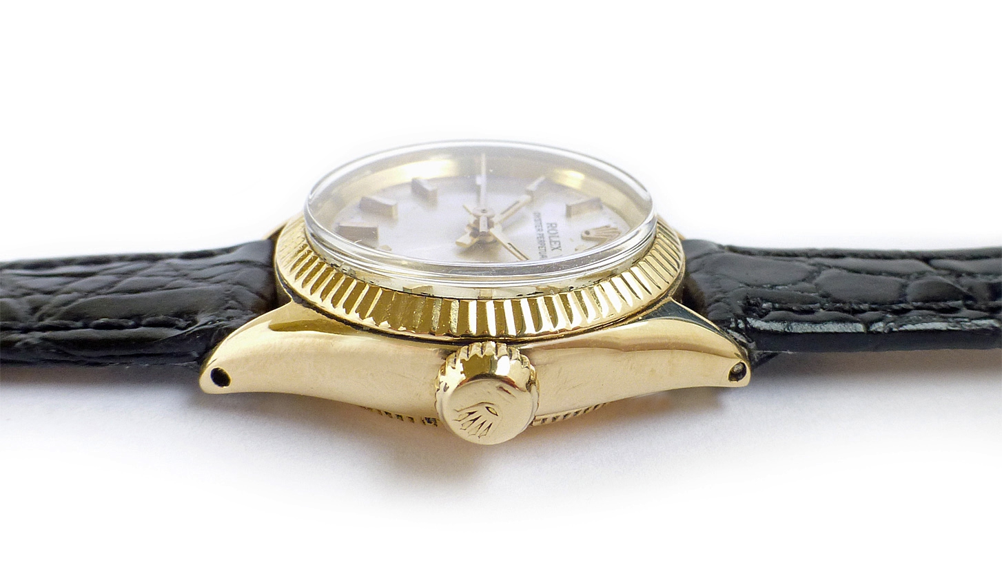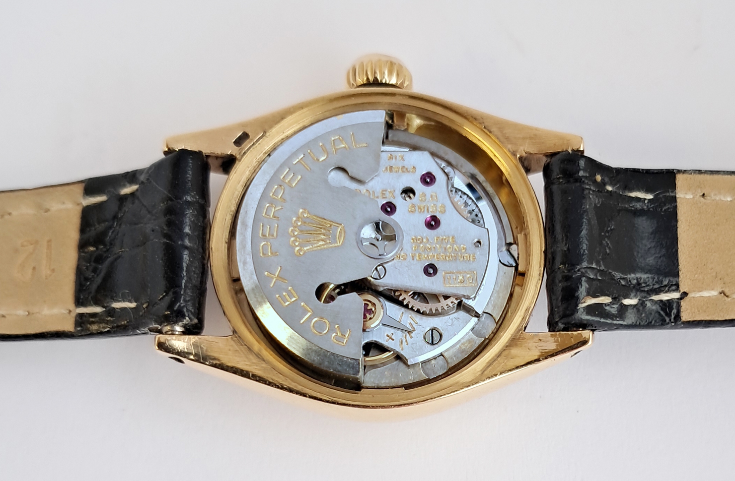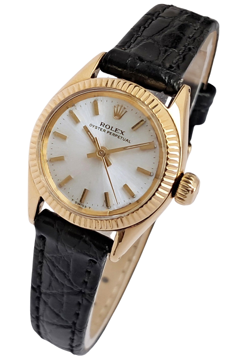 Ladies Rolex Oyster Perpetual automatic wristwatch model reference 6619 in 18 karat yellow gold. It has just had a complete service and is in excellent running order. It has a replacement leather strap but has a brand new 18k genuine Rolex buckle. The buckles cost in excess of £500. The bracelet has been scrapped at some point in its life as there is some bracelet rub between the lugs when the strap is removed. This cannot be seen though as the strap hides it. However part of the serial number is eroded due to the bracelet rub so hard to determine the age. It is an acrylic crystal and slightly older style so at a guess late 1960’s to early 1970’s. It is a classic oyster case with screw down crown and fluted 18 karat gold bezel. The crown is signed with the Rolex crown and has a screw on case back. The dial is a pearly silver colour. It is a thick case but still a small ladies classic looking watch. Small dent to case back and some patina to the dial, all visible in the pictures