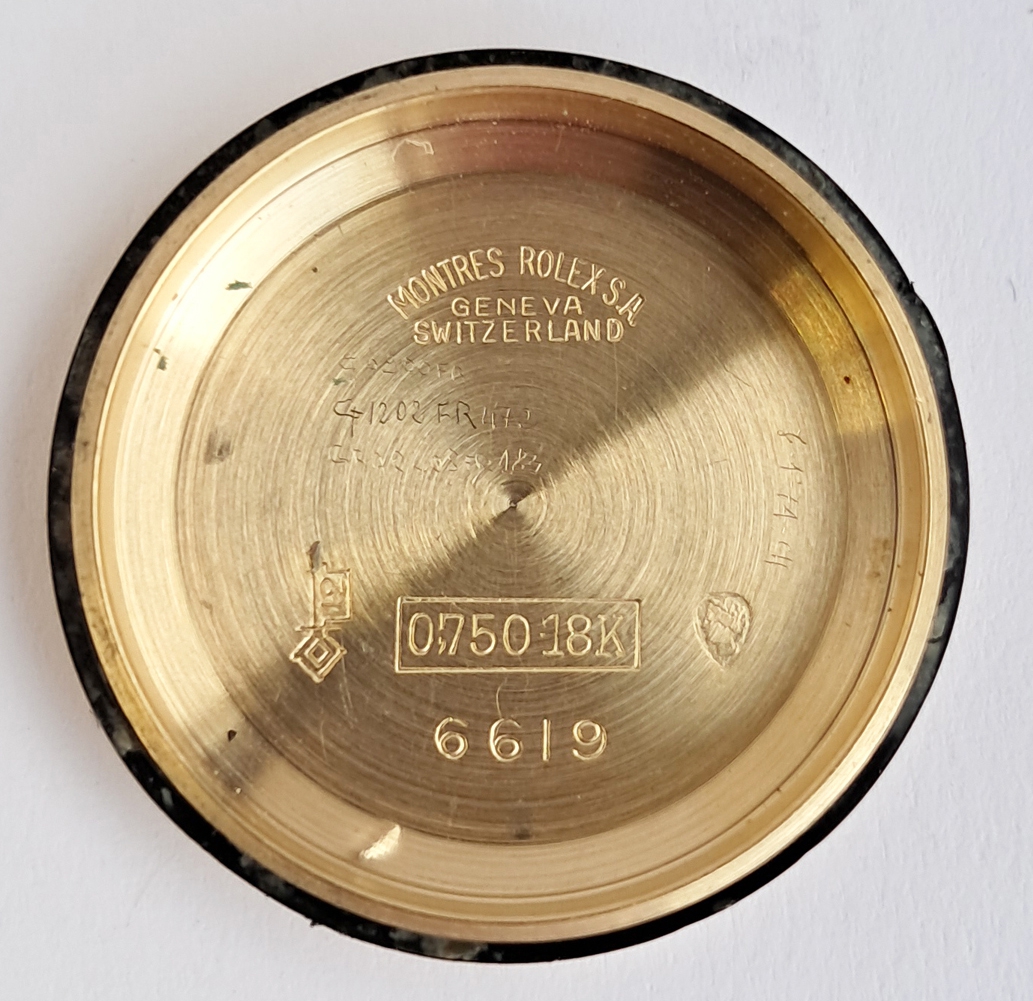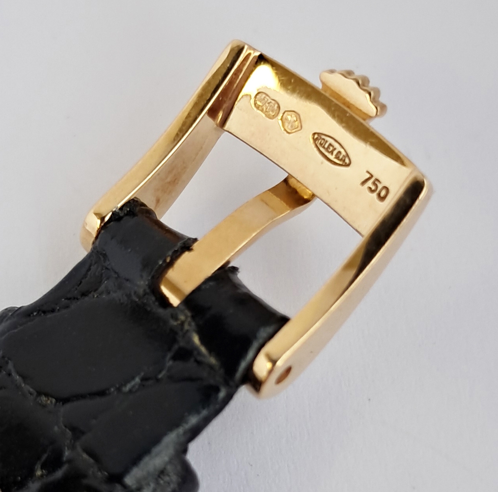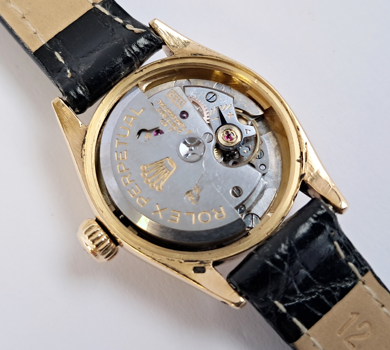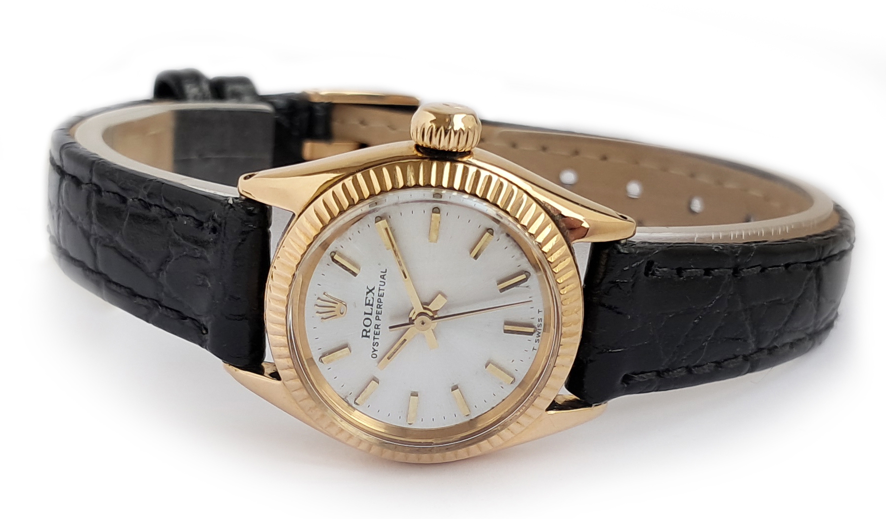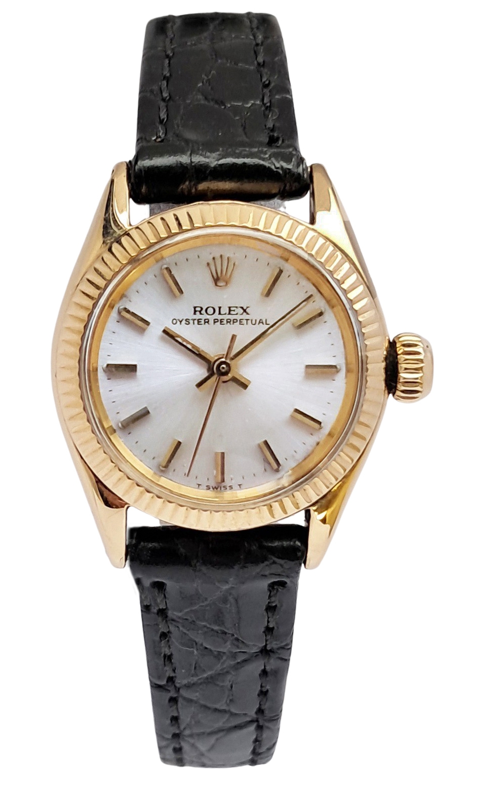 Ladies Rolex Oyster Perpetual automatic wristwatch model reference 6619 in 18 karat yellow gold. It has just had a complete service and is in excellent running order. It has a replacement leather strap but has a brand new 18k genuine Rolex buckle. The buckles cost in excess of £500. The bracelet has been scrapped at some point in its life as there is some bracelet rub between the lugs when the strap is removed. This cannot be seen though as the strap hides it. However part of the serial number is eroded due to the bracelet rub so hard to determine the age. It is an acrylic crystal and slightly older style so at a guess late 1960’s to early 1970’s. It is a classic oyster case with screw down crown and fluted 18 karat gold bezel. The crown is signed with the Rolex crown and has a screw on case back. The dial is a pearly silver colour. It is a thick case but still a small ladies classic looking watch. Small dent to case back and some patina to the dial, all visible in the pictures