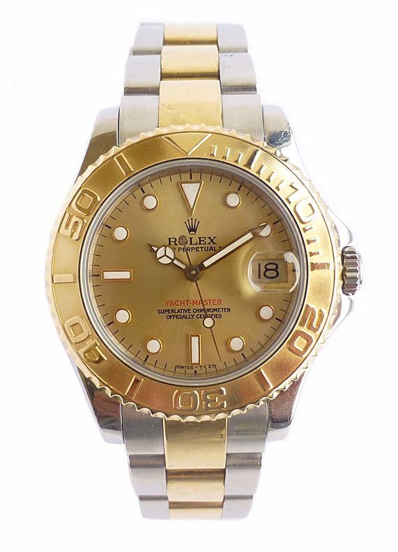 Good condition Rolex Yachtmaster model reference 168623. It was returned to Rolex in 2007 for a full service and comes with the service warranty card. It also comes complete with all boxes and papers including the chronometer certificate indicating that it was purchased from authorised Rolex dealers, Goldsmiths in the UK in 1997. It has all of the correct papers and booklets including the hang tag with the serial number o the hang tag. It is a mid size, so unisex watch in steel and gold. Mid Size model. Dimensions are 35 mm excluding the crown 38 mm including the crown, 40 mm lug to lug and 11mm thick.