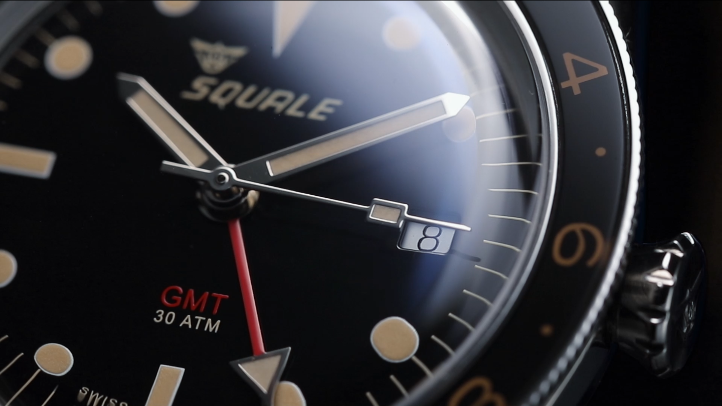 The red hand of the GMT was designed to allow the second time zone to be read easily in conjunction with the rotating 24-hour bezel when not underwater. The box-shaped, scratch-resistant sapphire crystal captures the charm typical of many Squale models from the 60s, while the conical crown has roots in the world of pilot watches and aviation instruments.